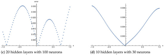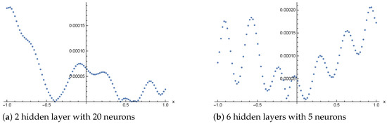 This section is dedicated to the practical applications of physics-informed neural networks in the domain of ordinary differential equations, partial differential equations, and integro-differential equations. The manuscript considers the following equations: the Poisson equation, the Burgers’ equation, and the Volterra integro-differential equation. For clarity and to better justify the choice of test problems, we briefly outline the key differences between the Poisson Equation (2) and the Burgers’ Equation (3). The Poisson equation in the considered form is a linear, second-order elliptic equation depending only on the spatial variable, thus describing a stationary boundary-value problem. In contrast, the Burgers’ equation is an evolutionary equation, which for has a parabolic character, involves the time derivative, and requires both an initial condition and boundary conditions. Unlike the linear diffusion operator in the Poisson equation, Burgers’ equation contains the nonlinear advection term , leading to much more complex phenomena such as the formation of steep gradients or shock waves in the limit . These differences also result in distinct solution behaviors: for the Poisson equation, solutions are smooth (for smooth input data) and free of discontinuities, whereas the Burgers’ equation can generate boundary layers and high-gradient structures, requiring careful consideration when choosing numerical methods. In practice, this means that solutions of the Poisson equation can be relatively easily approximated using PINNs, while for the Burgers’ equation, the additional challenge lies in accurately capturing the temporal dynamics and the nonlinear advection term. This sometimes necessitates denser sampling in regions with steep gradients or appropriate weighting of the loss function components during the training of the network. To explicitly quantify the accuracy of our implementations, we directly compared the PINN solutions with the exact analytical solutions for each test case. This provides implementation-specific error bounds, expressed as mean and maximum errors, which are reported in the corresponding tables and figures.