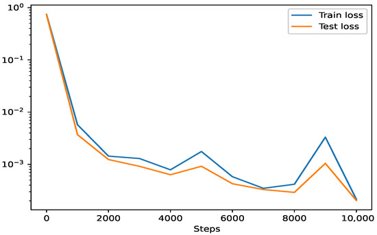 The train loss and test loss during the process of solving Equation (2) is shown in Figure 3. It can be seen that the training loss and test loss exhibit a strong correlation, with both decreasing sharply in early steps before stabilizing. The minimal gap between training and test loss highlights the model’s balanced capacity.