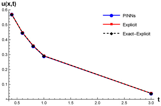 In Table 13, we provide numerical values of the solution at selected time points. It compares the results from the variational iteration method [42], PINNs, and the exact solution. It can be seen that at both solutions perfectly match the exact solution. The solutions [42] are generally better than PINNs for while for larger t values PINNs unexpectedly outperform solutions [42].