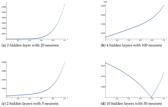 In Figure 6, the error distribution at the grid points is shown for four selected network architectures, while Figure 7 shows prediction from PINN for two hidden layers and 20 neurons.