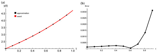 Plots of the approximated and exact solution (a) and the absolute approximation error (b).