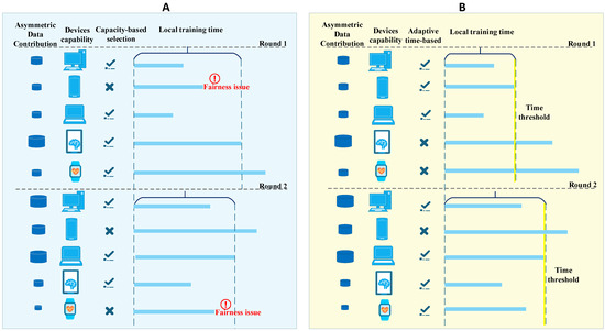 However, the random selection of clients in traditional FL methods remains challenging due to heterogeneous client training times, imbalanced dataset updates [5], dynamic client participation, varying resource and computing capacities [6], and high communication costs. It significantly impacts FL convergence and efficiency. The heterogeneity of clients leads to diverse training times for clients, resulting in delays and inefficient use of resources [7,8]. Furthermore, imbalanced data size updates are dynamically changing every round, resulting in varying times for completing the training, which causes more delays [9,10]. As IoT devices typically operate in diverse network conditions, the inconsistency in bandwidth, latency, and reliability tend to occur. Furthermore, asymmetric data contribution every round result in differing communication patterns with the server. In cases where the connection is slow or drops out, it increases communication costs or generates a straggler problem [9,11]. To mitigate the challenges in traditional FL, the author in [12] introduced an innovative FL framework, named FLASH-RL, where the clients selected to participate are generated using Deep Reinforcement Learning (DRL). By observing clients’ hardware conditions, the reputation-based utility function learned the clients’ performance and priority high scores for participation and then selected clients with high-reputation scores to distribute the training. However, this method is faced in a fairness issue selection manner. To address the challenge of the straggler, in [13], the FL protocol called FedCS was proposed, where the FL server obtains the resource condition of clients and selects a subset of clients to distribute the training and those clients transmits back the model update within a fixed deadline. However, resource conditions and client data’s size updates are dynamically changed, so adaptive deadline time is required to guarantee performance improvement and low communication costs in the dynamic environment.