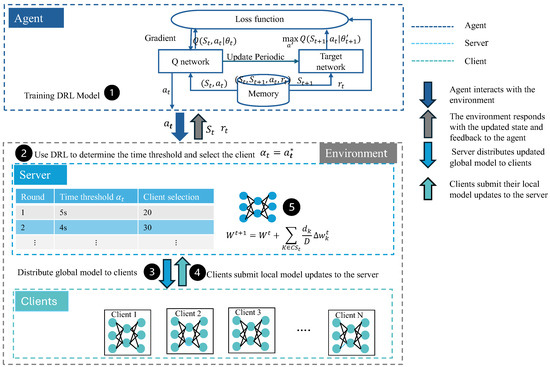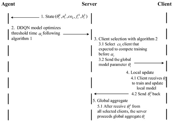 First, the central server has all the information of the client called state , which will be provided to an agent as an input of DDQN model training. The DDQN model processes this state and returns an optimal time threshold , which the server uses to set the time limit for client selection in the current round. Next, the server estimates the expected training time of each client based on the state and selects clients whose training time is less than or equal to the threshold. The selected clients receive the global model parameters, perform local training, and send their updated models back to the server.