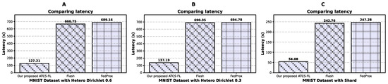 Latency of MNIST dataset under (A) hetero Dirichlet 0.6, (B) hetero Dirichlet 0.3, and (C) non-IID label.