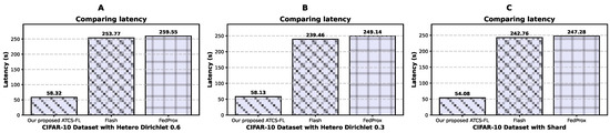 Latency of CIFAR-10 dataset under (A) hetero Dirichlet 0.6, (B) hetero Dirichlet 0.3 and (C) Shard.