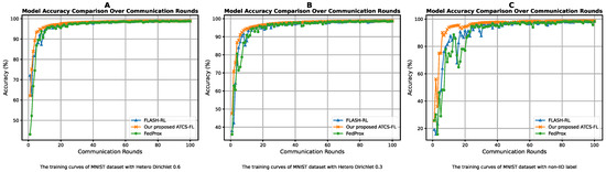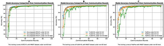The accuracy of the MNIST datasets of (A) ATCS-FL, (B) FLASH-FL, and (C) FedProx compares the difference at three levels of non-IID.