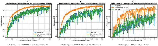 Accuracy of CIFAR-10 dataset under (A) hetero Dirichlet 0.6, (B) hetero Dirichlet 0.3, and (C) Shard.