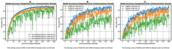 The accuracy of the CIFAR-10 dataset of (A) ATCS-FL, (B) FLASH-FL, and (C) FedProx compares the difference at three levels of non-IID.