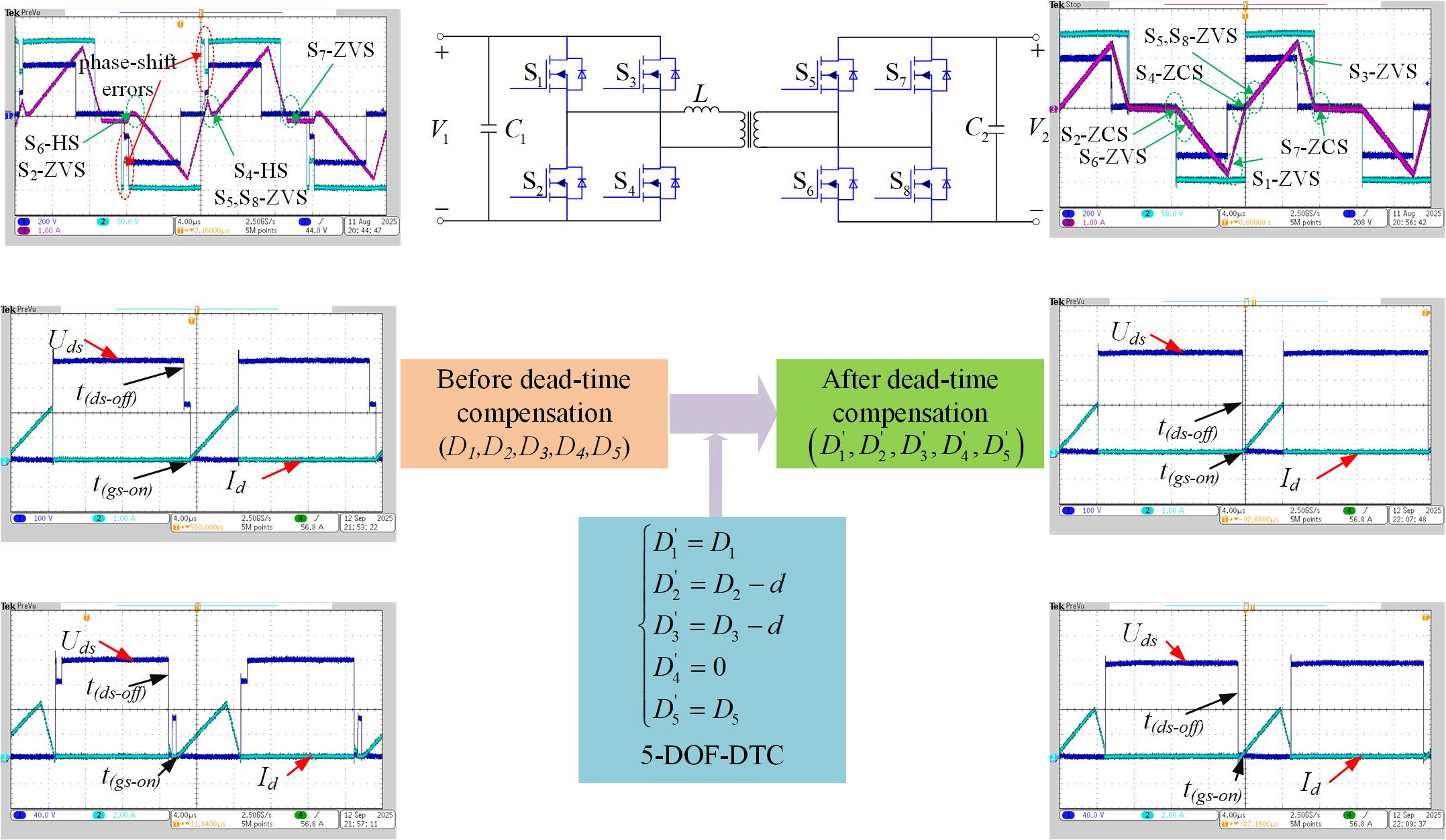 To address issues such as duty cycle reduction, distortion of inductor voltage and current waveforms, hard switching, and narrowed transmission power range caused by dead time, this paper proposes a dead-time compensation (5-DOFs-DTC) control strategy based on five-degree-of-freedom modulation to achieve dead-time compensation over the full power range. The differences between the existing 5-DOF and 5-DOF-DTC are as follows: