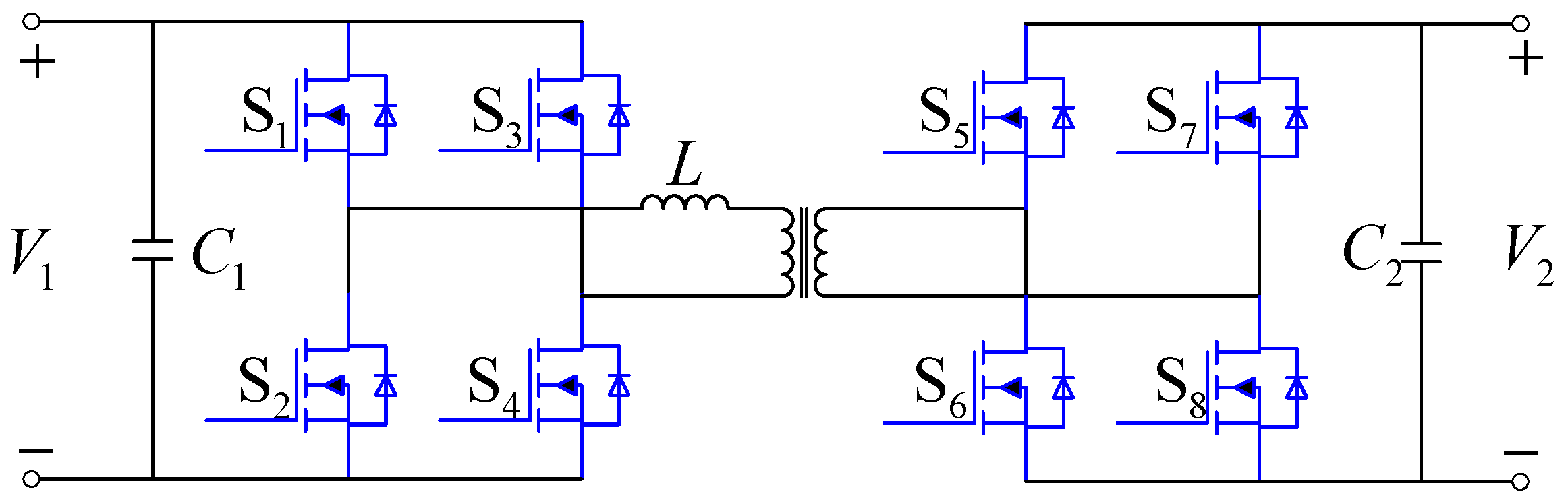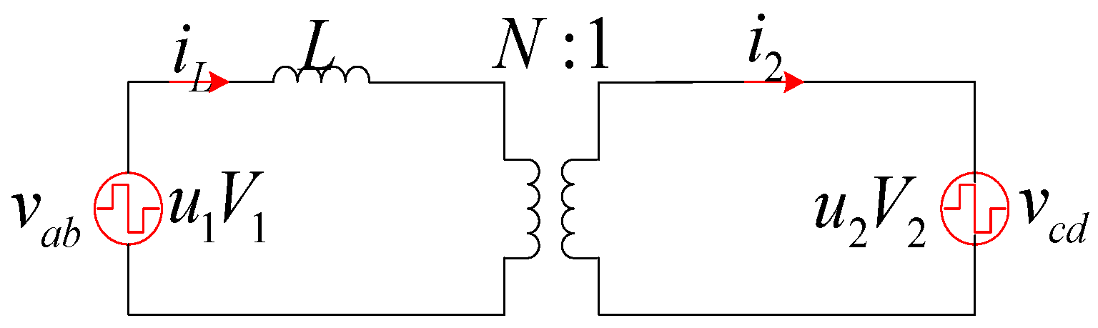 4]. Due to the completely symmetrical circuit structure of the DAB converter, it can realize bidirectional energy transfer. The power flow direction depends on the master–slave relationship of the H-bridges, and the idealized equivalent circuit of the DAB is shown in