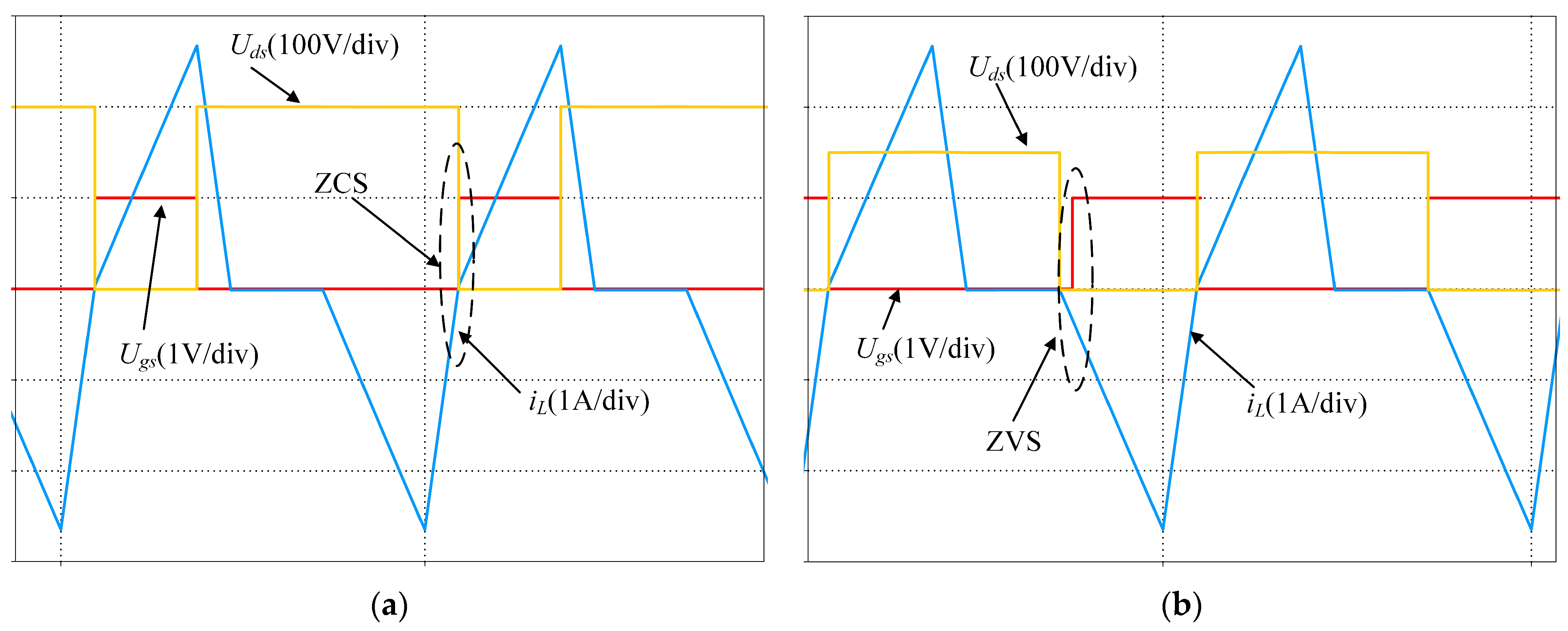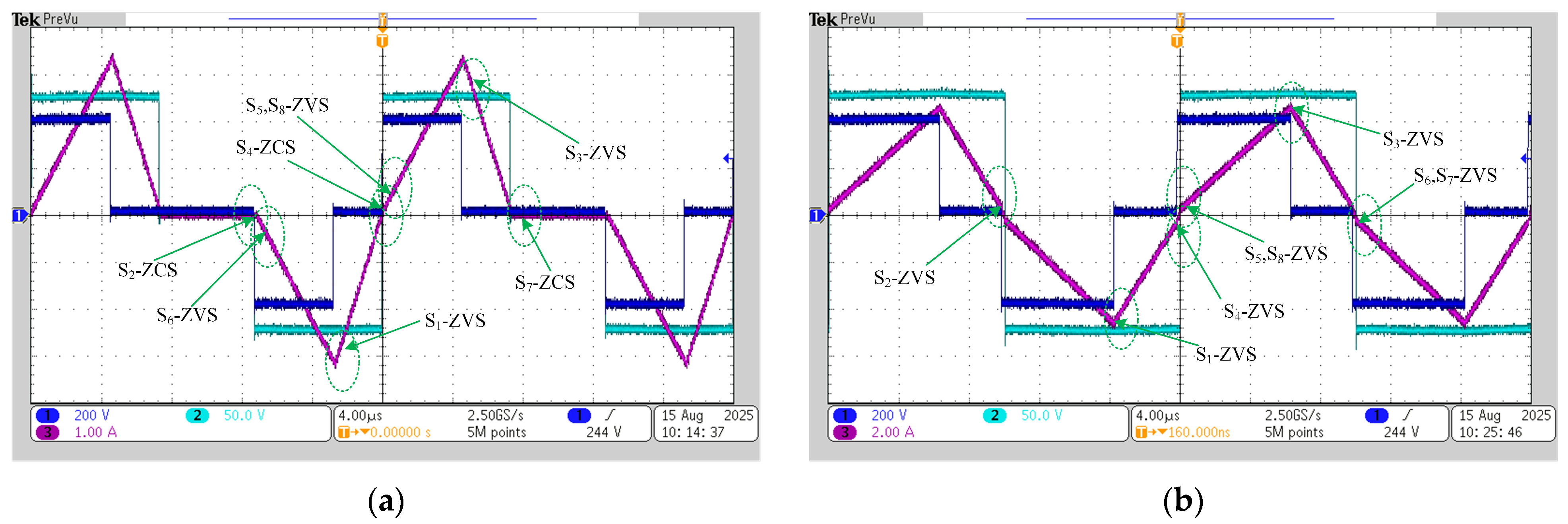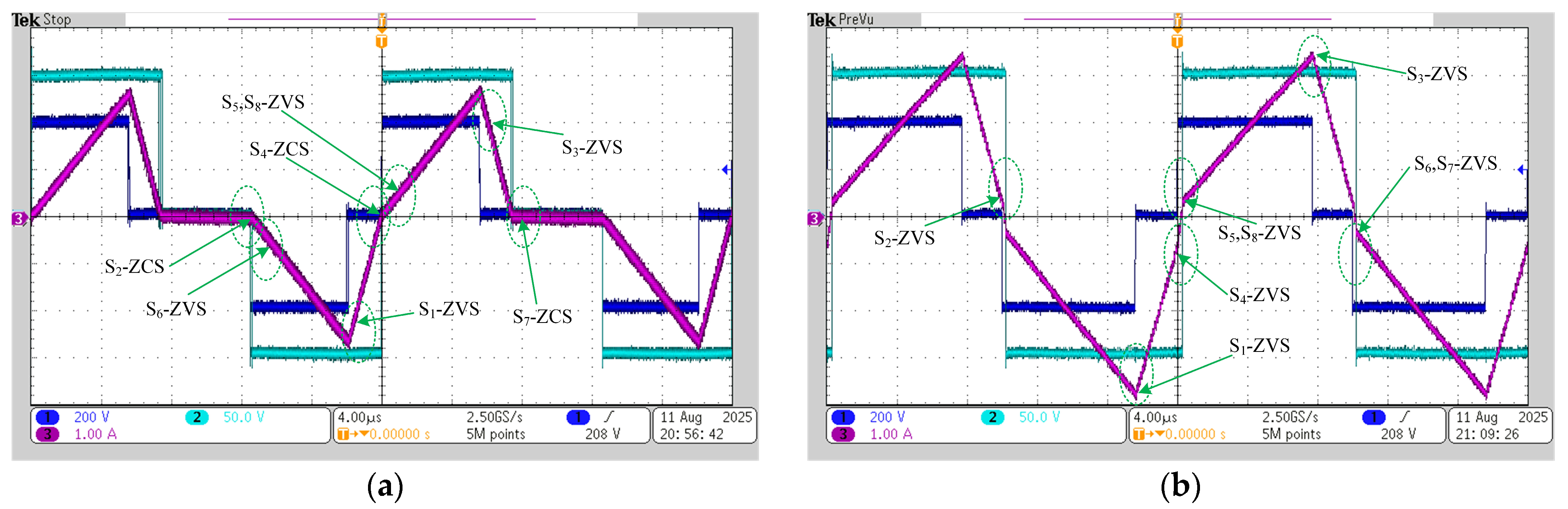For switching tube S5, by comparing the start-up currents before and after the introduction of dead time, and defining as the difference between the start-up current after adding dead time and that without dead time, it can be found that . Therefore, after adding dead time, the start-up current of switching tube S5 still satisfies ZVS. For switching tube S4, by comparing the start-up currents before and after the introduction of dead time, and defining as the difference between the start-up current after adding dead time and that without dead time, it can be found that the value of can be either positive or negative, which mainly depends on the magnitude of the dead time duty cycle d. Therefore, after adding dead time, the start-up current of switching tube S4 does not necessarily satisfy ZVS. From the above analysis, it can be concluded that after the introduction of dead time, not all switching tubes in Mode F can satisfy ZVS, so their ZVS capability is weakened after adding dead time.