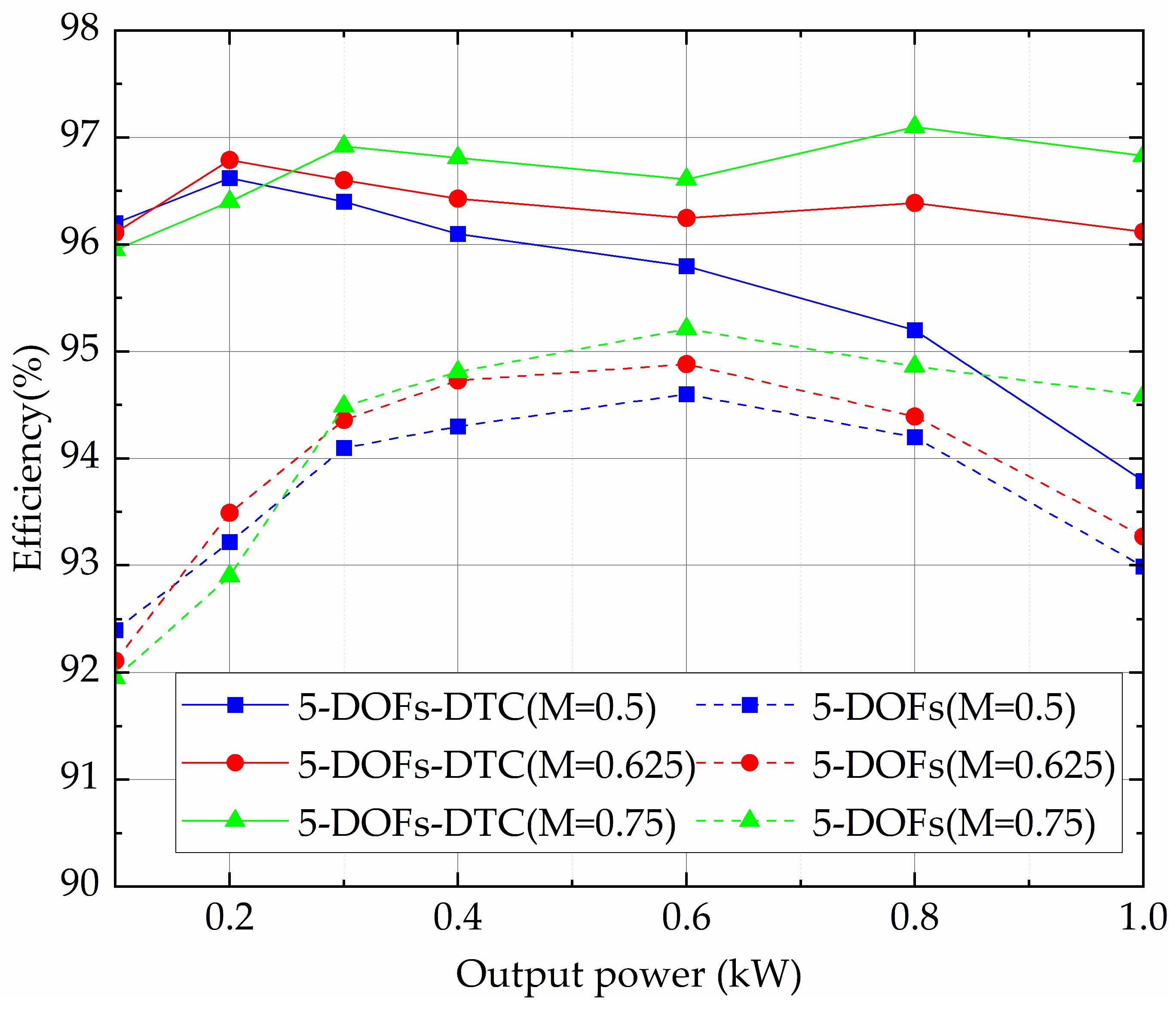 Table 1 makes a comparison in terms of transmission power range, soft-switching characteristics, efficiency improvement, and adaptability. It can be seen that the five-degree-of-freedom modulation strategy can well adapt to both symmetric and asymmetric duty cycles, and has excellent soft-switching characteristics.