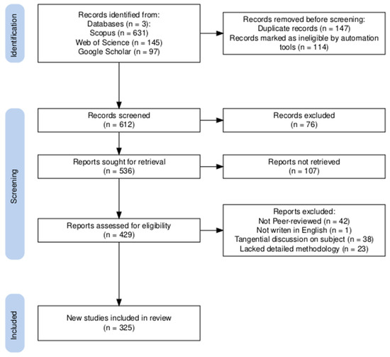 A total of 873 publications (631 from Scopus, 145 from Web of Science, and 97 from Google Scholar) indexed between 2015 and 2025 were identified on 26 May 2025. The search query was refined to limit the records to Computer Science Conference papers, articles, and book chapters in the English language. This reduced the records count to 612 (443 from Scopus, 113 from Web of Science, and 56 from Google Scholar). The search query used is: