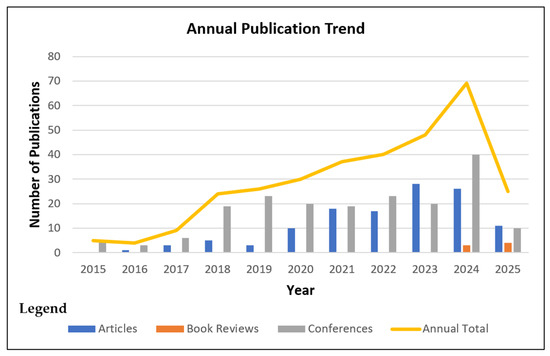 Annual Publication Trend for Articles, Book Reviews, and Conference Papers.