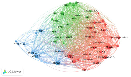 The blue cluster features authors like Wang Y., Meng W., Zhang Y., and Wang H., who focus on distributed and cloud-native insider threat solutions. Their research broadens the conventional detection paradigms to encompass federated learning, edge computing, and environments that prioritize privacy considerations. For example, refs. [20,48,49] explore innovative techniques for scaling threat detection in decentralized architectures, reflecting a shift toward real-world deployment in complex infrastructures. Although less densely connected than the red and green clusters, the blue cluster exhibits strong internal cohesion and an emerging thematic niche centered on operational scalability and adversarial resilience.