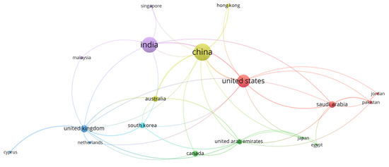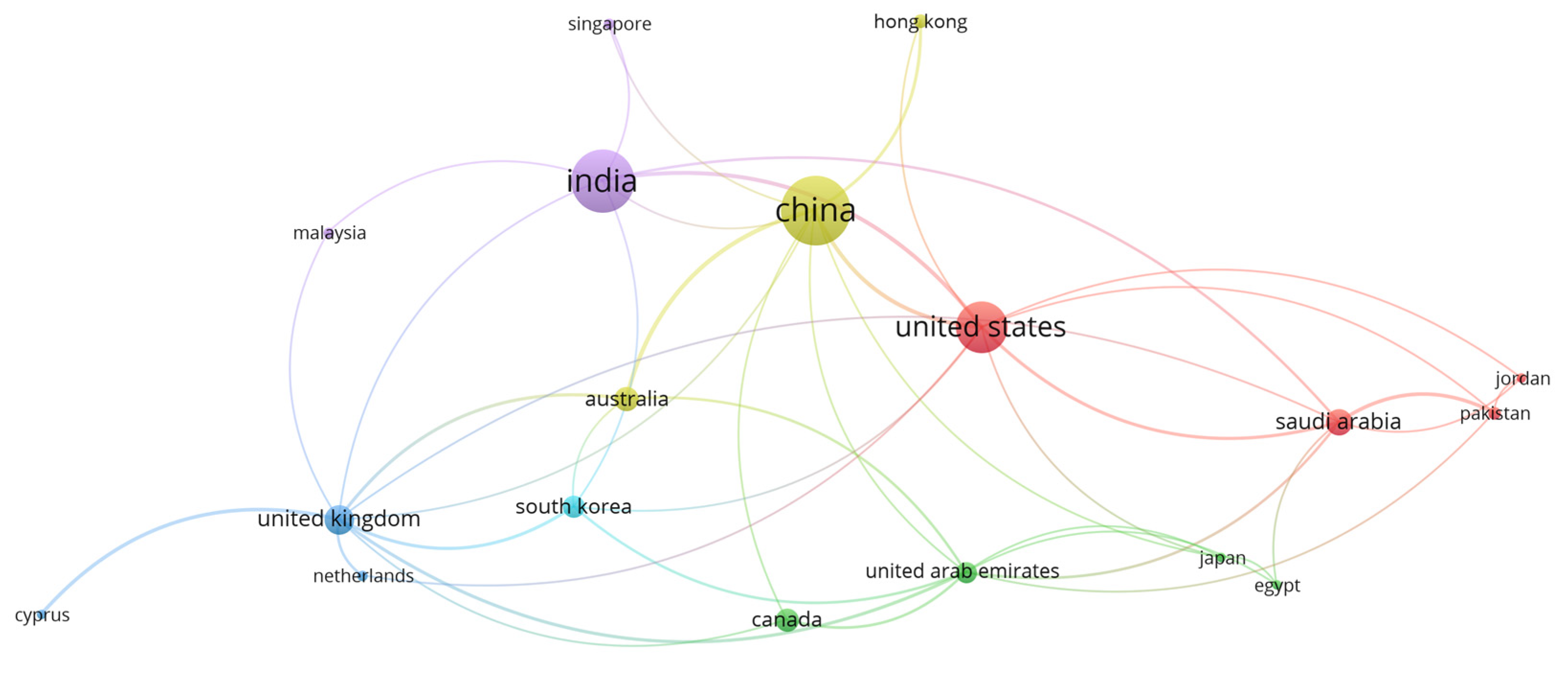 The co-authorship network reveals a maturing global community centered around a tri-polar axis of China, India, and the United States, supported by regional contributors from the GCC, Asia-Pacific, and Western Europe. The interplay between local innovation and global collaboration is shaping not only the thematic orientation of the field but also its methodological and geopolitical contours.