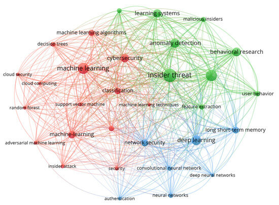The green cluster is centered around terms such as “insider threat,” “anomaly detection,” “user behavior,” and “behavioral research,” indicating a conceptual shift toward behavioral modeling and context-aware analysis of insider actions. In contrast, the blue cluster highlights deep learning methodologies, with keywords such as “deep learning,” “convolutional neural networks,” “neural networks,” and “long short-term memory,” reflecting the growing focus on temporal and sequential modeling of insider activities.