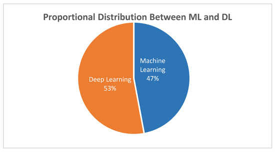 Figure 6 illustrates the proportional distribution between ML and DL techniques, showing that deep learning makes up 53% of the documented algorithmic usage, slightly surpassing the 47% attributed to traditional ML models. This proportional dominance indicates a significant methodological shift over the past decade. From 2015 to 2018, insider threat detection efforts mainly relied on ML techniques such as Decision Trees, Random Forest, and Support Vector Machine. These models offered interpretable decision-making frameworks and were well-suited for structured datasets. However, after 2019, there has been a clear increase in the adoption of DL techniques, especially LSTM (49 occurrences), Neural Networks (41), and CNN (29), as shown in Table 2, highlighting a broader shift toward data-driven, temporal modeling strategies.