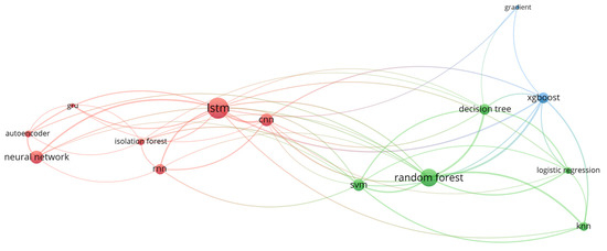 The keyword co-occurrence network derived from bibliographic metadata reveals the intellectual landscape and thematic evolution of research on insider threat detection. Three major thematic clusters are evident within the network, each representing a distinct area of focus. As illustrated in Figure 5, the red cluster emphasizes machine learning-based classification and algorithmic detection, characterized by frequently co-occurring terms such as “machine learning,” “support vector machine,” “decision trees,” “random forest,” and “classification,” indicating the firm foundation of classical supervised learning techniques that dominated early research.