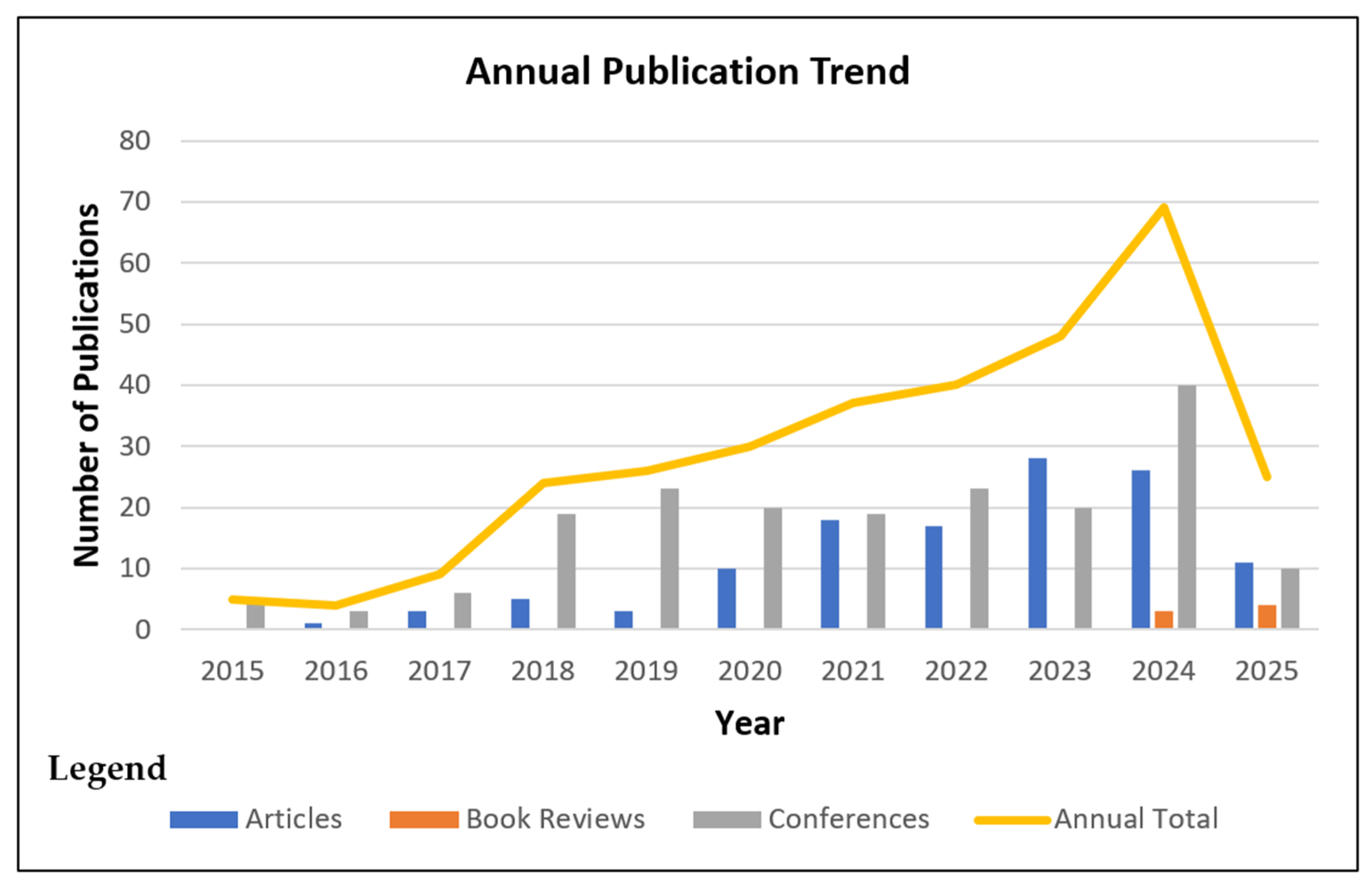There was a consistent upward trajectory in academic output on the application of ML and DL methods for insider threat detection in cybersecurity, with varying intensity across years within the period under review. The total publication count for 2015 consisted of five conference papers (