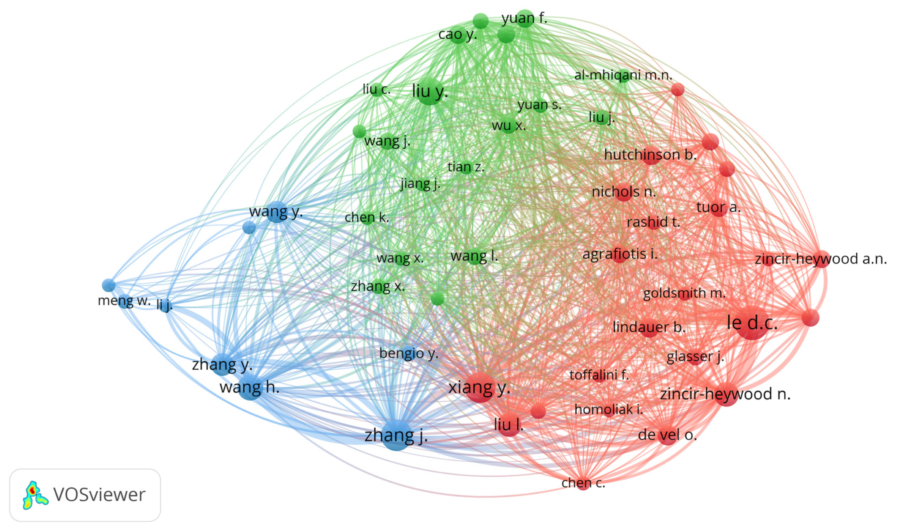 Crucially, the network also reveals inter-cluster connections, especially via authors such as Xiang Y., Liu J., and Homoliak I., who occupy intermediary positions between the red and green clusters as shown in