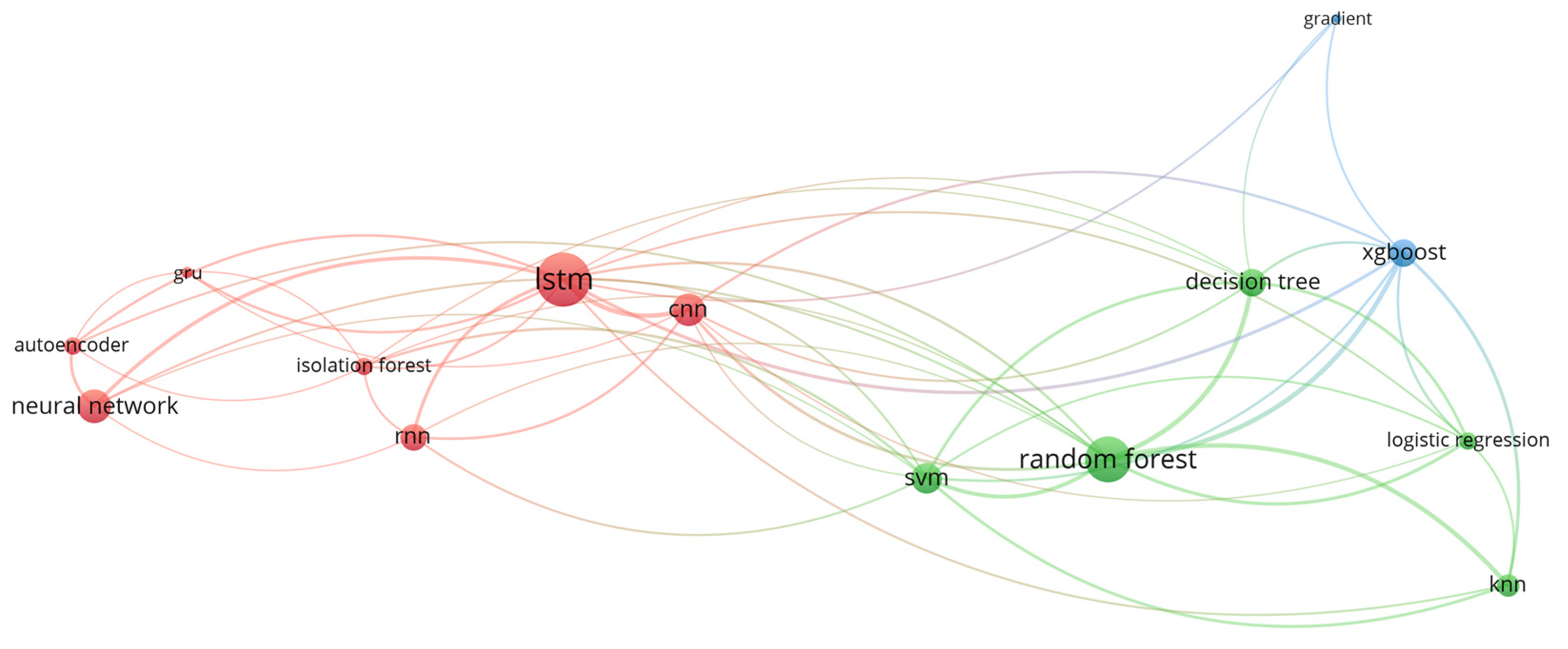 Figure 7 illustrates the co-occurrence network of algorithms. At the center of this network are LSTM, Random Forest, and CNN, all of which show high edge density, making them key bridging nodes across different paradigms. LSTM demonstrates strong connections with both deep learning peers, like Neural Network and Autoencoder, and machine learning algorithms such as Random Forest and XGBoost, highlighting its flexibility in both temporal modeling and ensemble methods. Similarly, Random Forest acts as an important hub connecting to a wide range of machine learning classifiers like SVM, Decision Tree, and Logistic Regression, illustrating its adaptability and ongoing popularity.