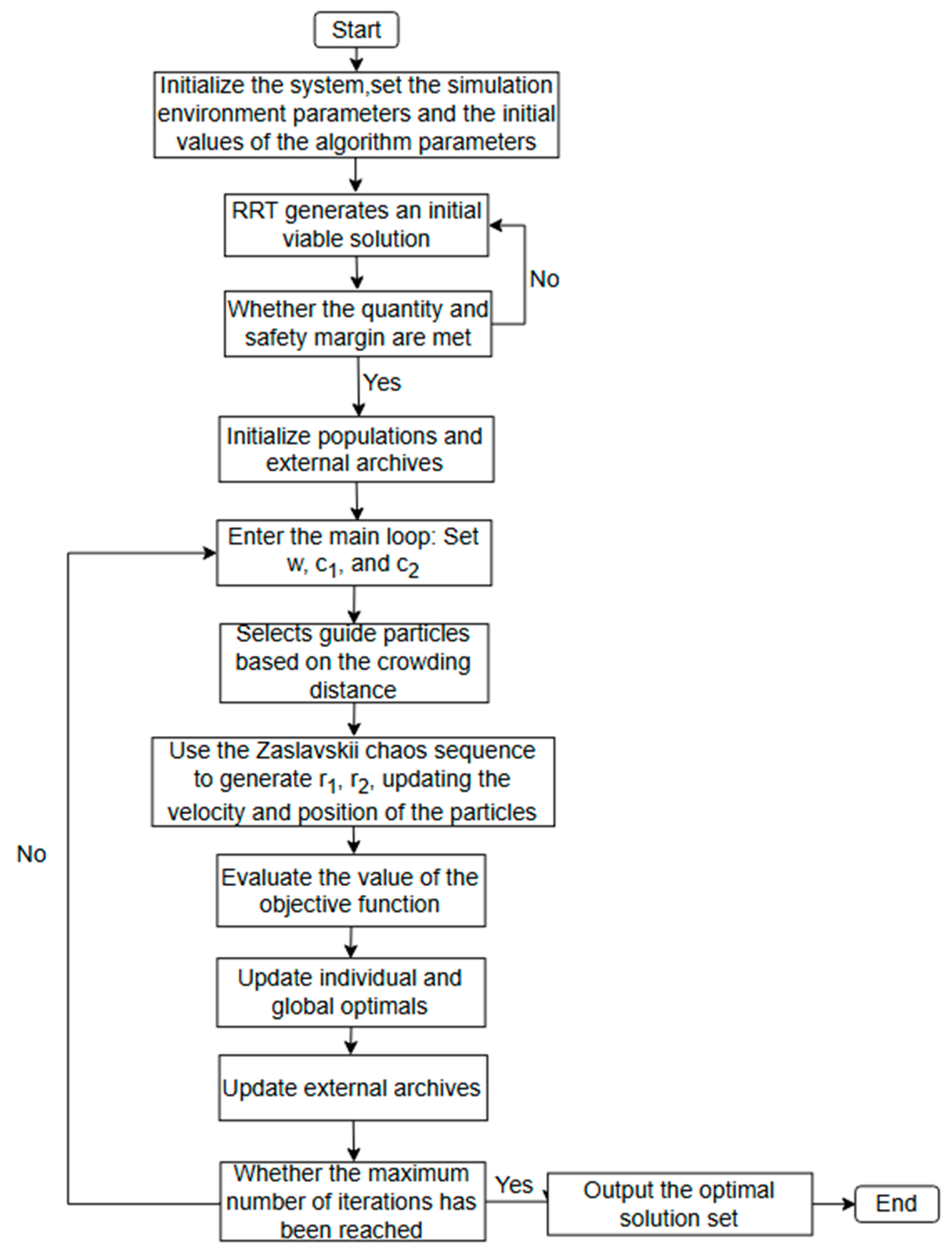 The advantage of multi-objective optimization lies in its ability to address multiple conflicting objectives simultaneously during the optimization process, without the need for predefined weights, and to generate a set of Pareto-optimal solutions, namely, solutions in the multi-objective space that cannot be further improved. Each solution on the Pareto set is feasible, allowing decision-makers to select the most appropriate option based on practical requirements, rather than relying solely on a single aggregated objective value, thereby enhancing both the flexibility and scientific rigor of decision-making. At present, the multi-objective particle swarm optimization (MOPSO) algorithm and its variants have been widely applied in path planning research [
