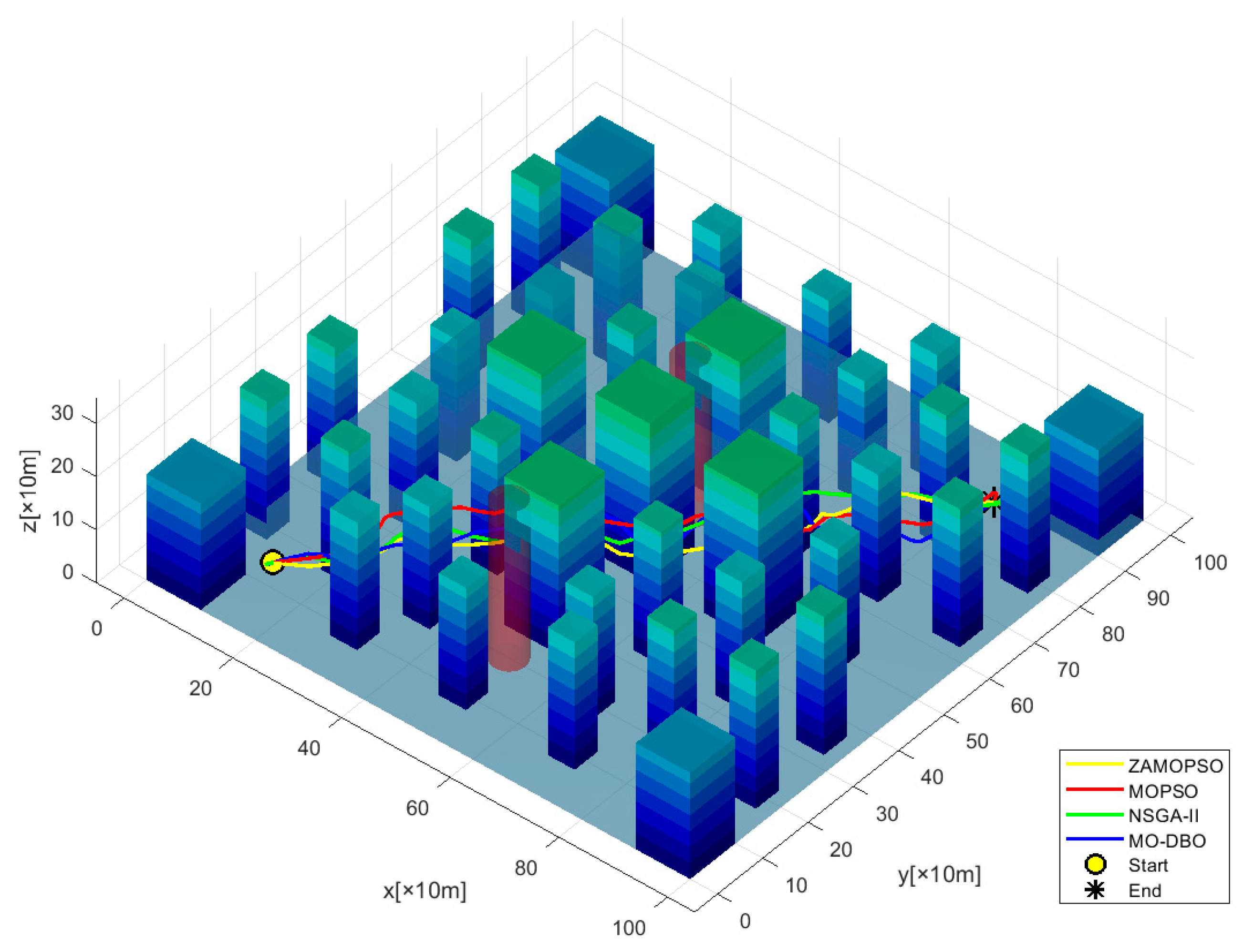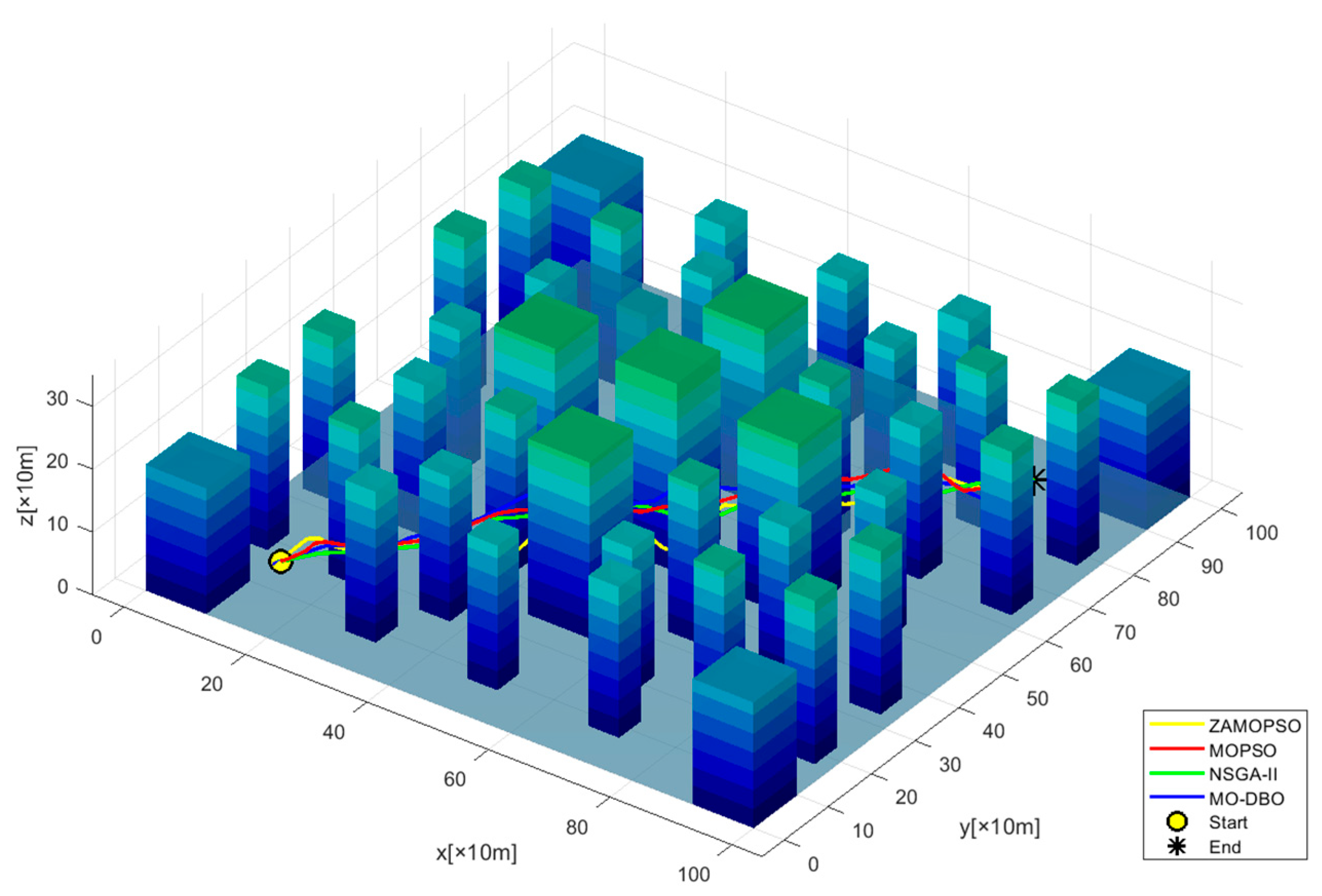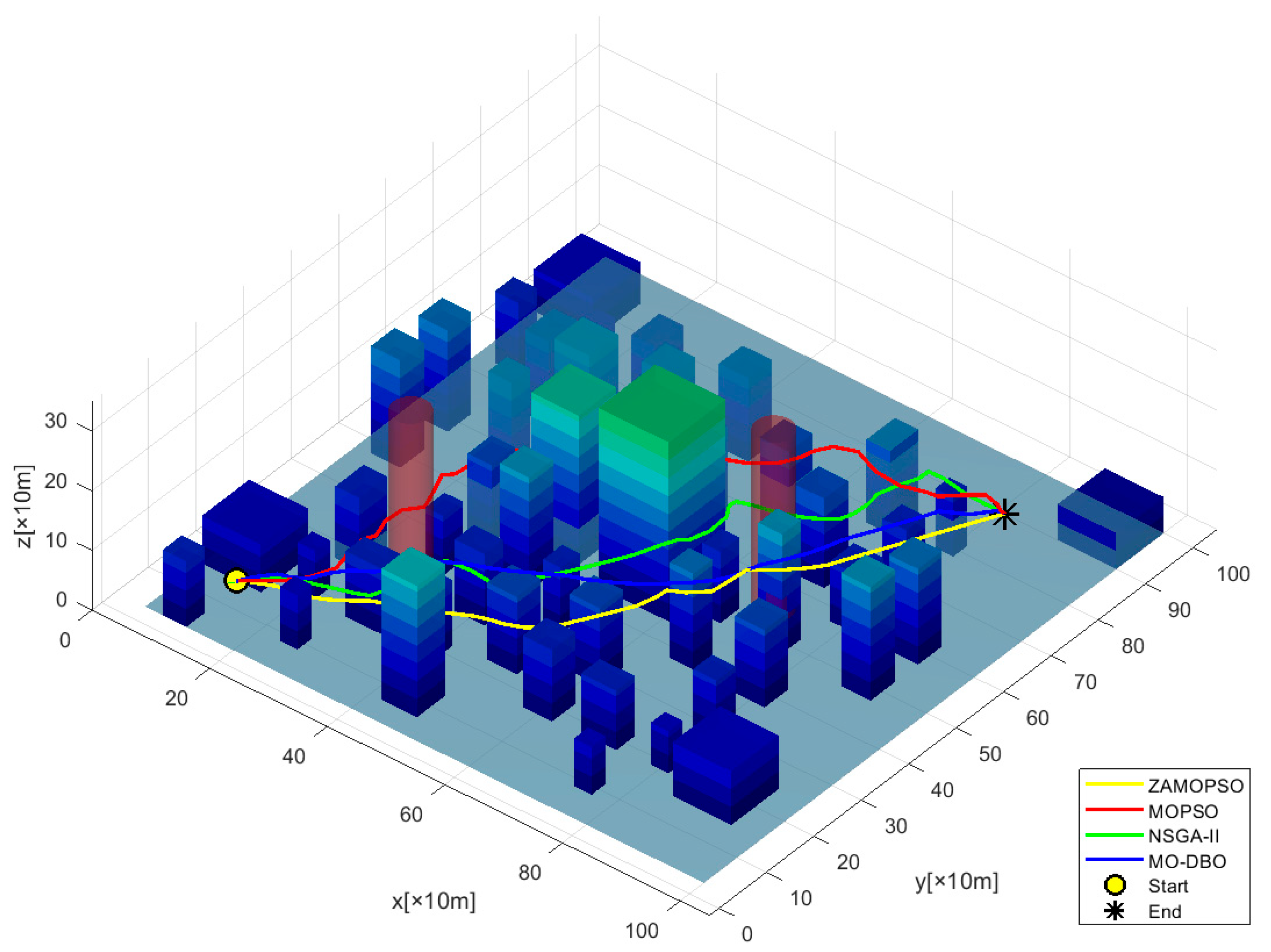 The proposed ZAMOPSO algorithm, along with other multi-objective optimization algorithms, was evaluated across different three-dimensional urban environment models. Comparative results indicate that ZAMOPSO achieves superior overall performance in solving UAV path planning problems in urban environments, and its effectiveness is further confirmed through ablation experiments.