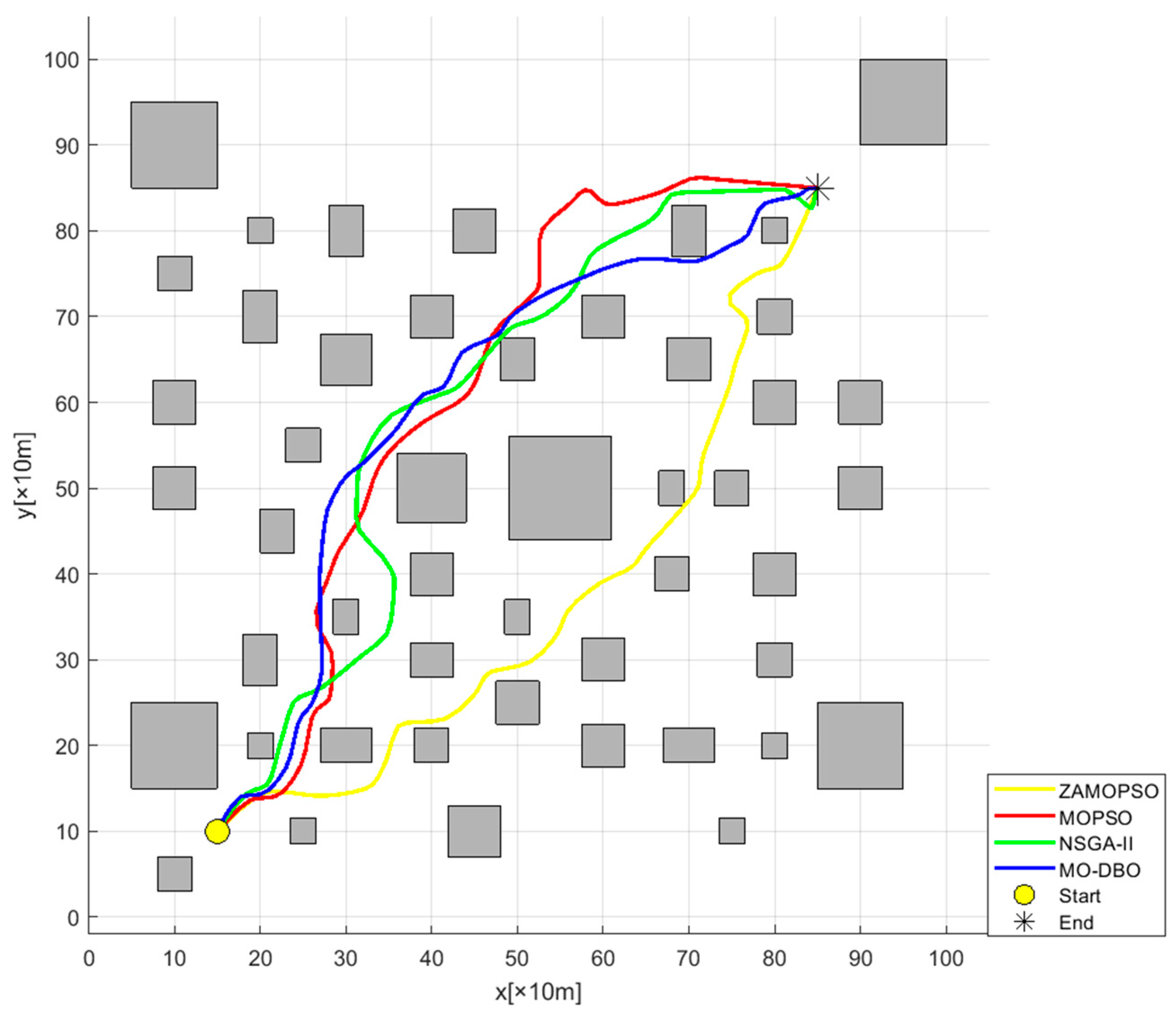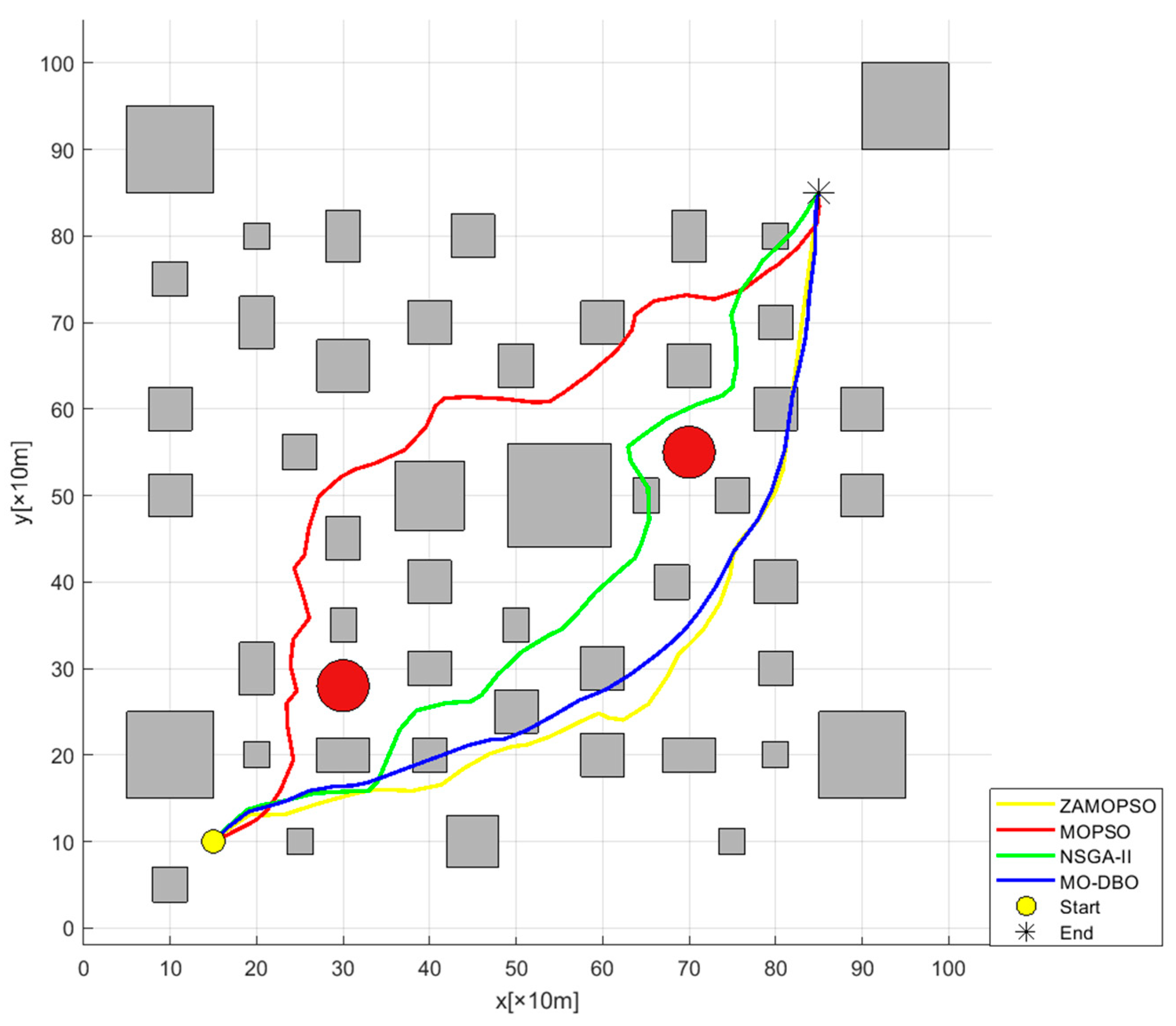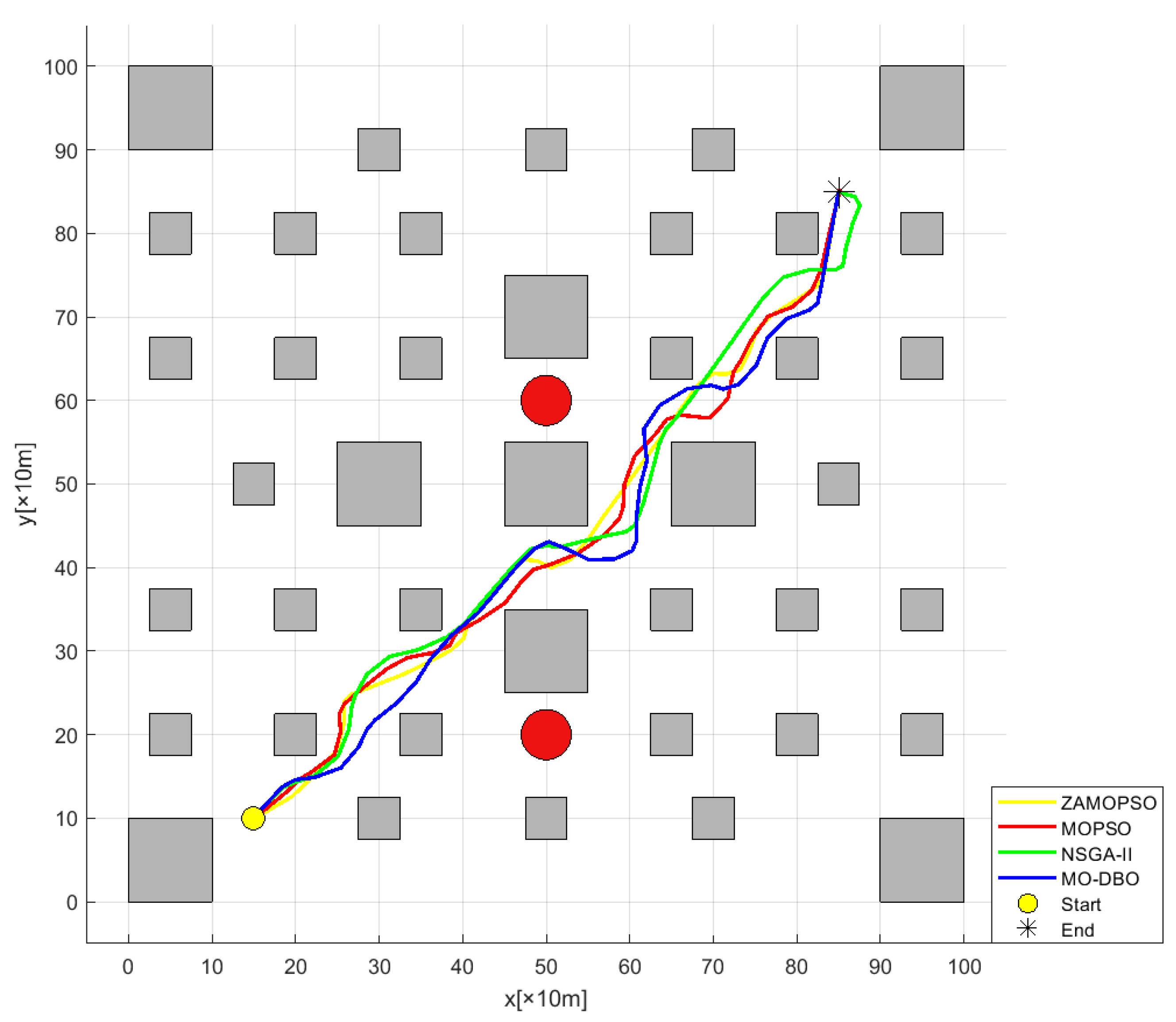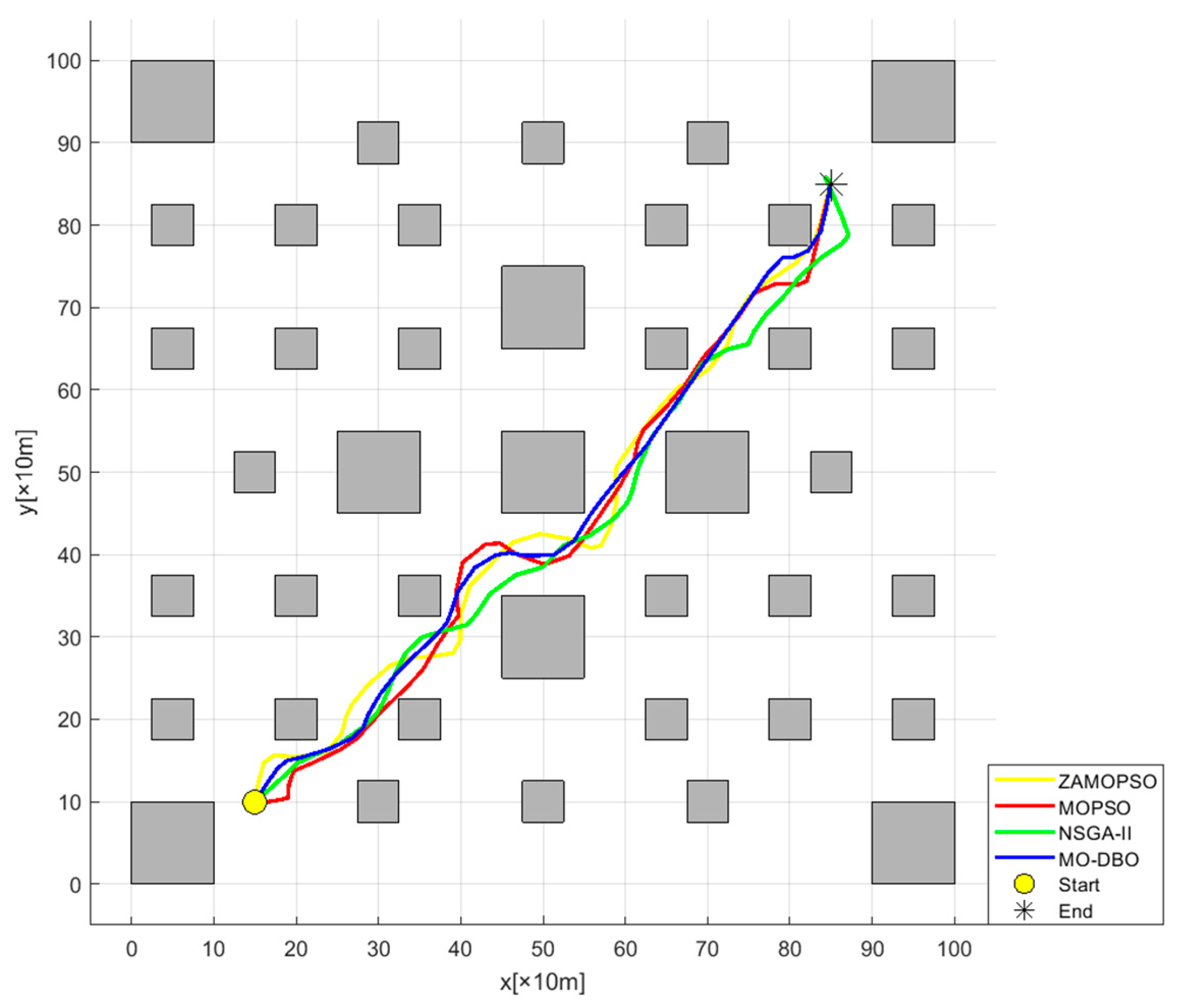 The proposed ZAMOPSO algorithm, along with other multi-objective optimization algorithms, was evaluated across different three-dimensional urban environment models. Comparative results indicate that ZAMOPSO achieves superior overall performance in solving UAV path planning problems in urban environments, and its effectiveness is further confirmed through ablation experiments.
