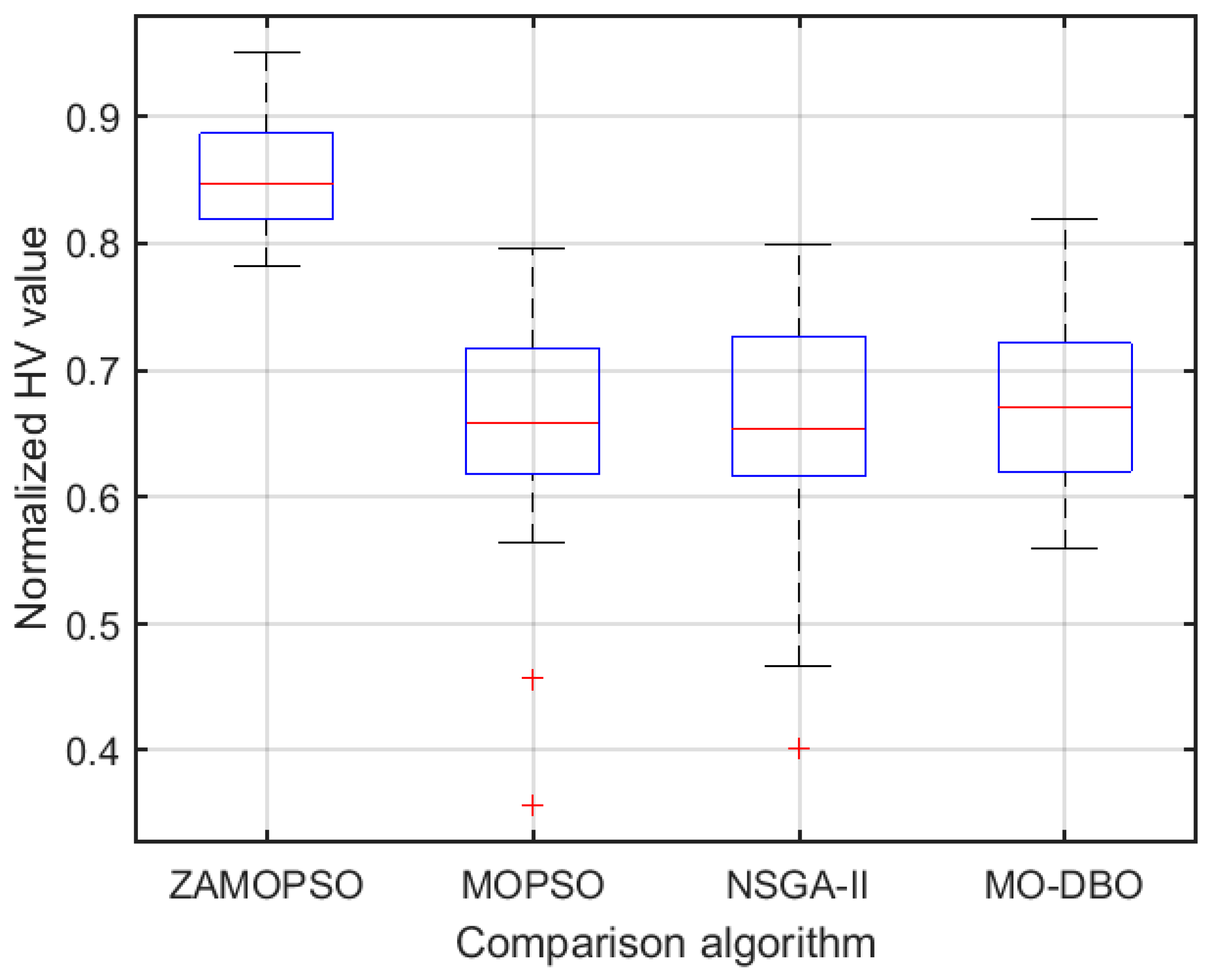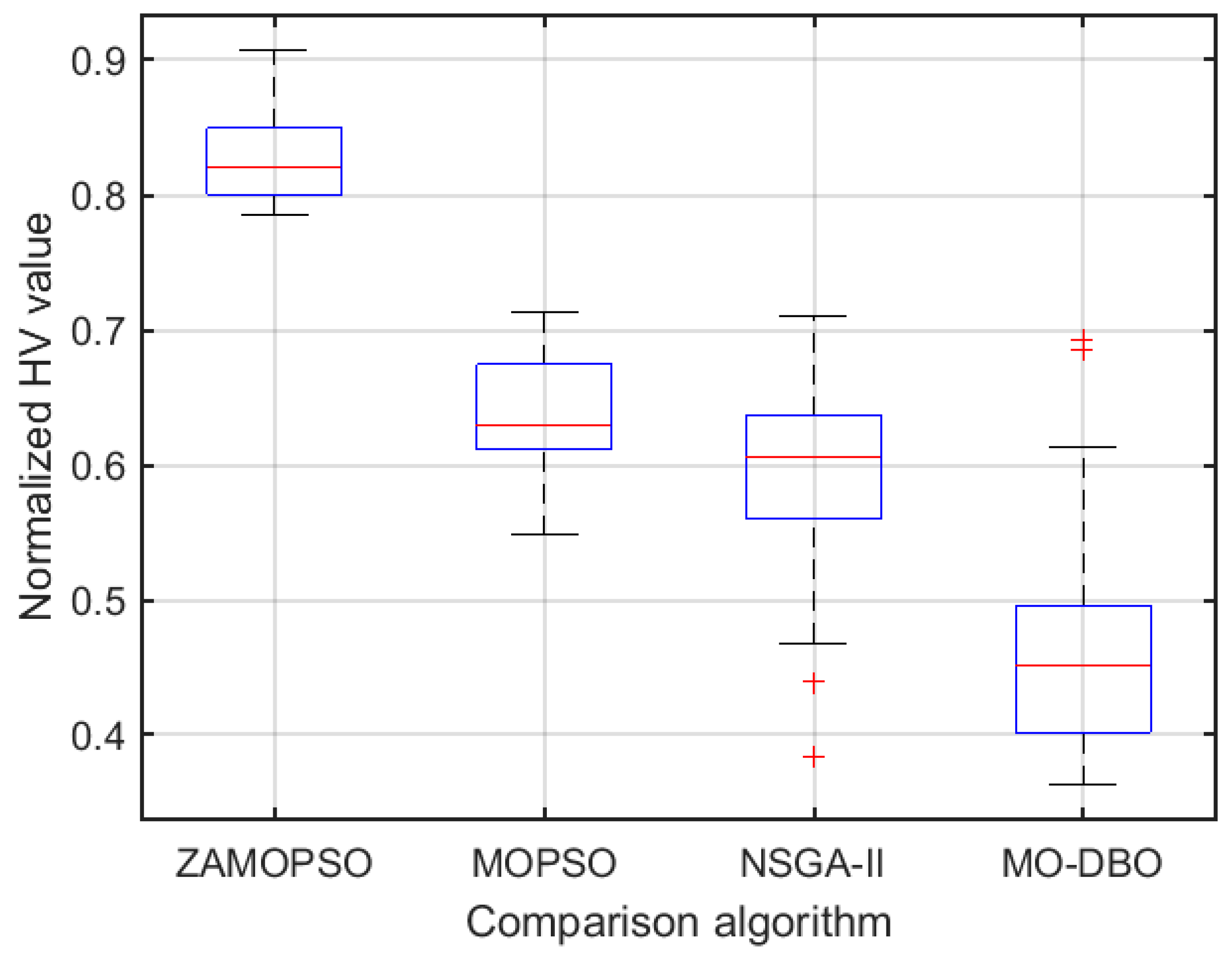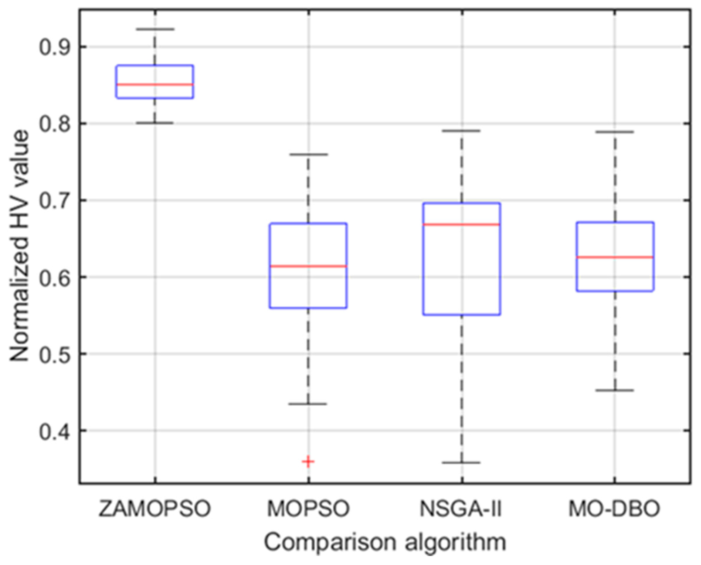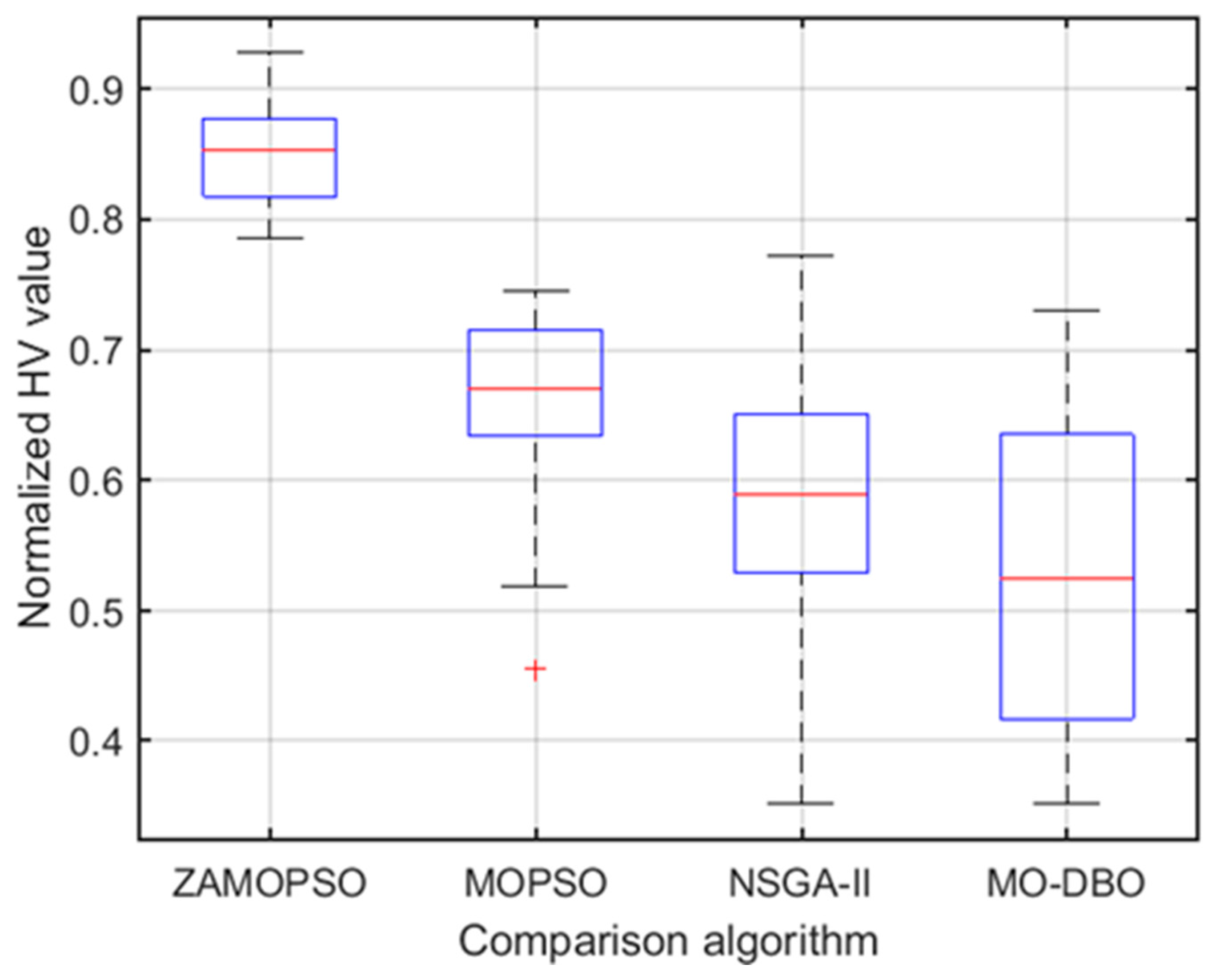 Table 18 displays the comparative HV metric results for each algorithm. As shown, compared with AMOPSO, the maximum HV, minimum HV, and mean HV of ZAMOPSO increased by approximately 21.47%, 36.45%, and 20.79%, respectively, indicating that the particle update strategy based on the Zaslavskii chaotic sequence effectively improved the convergence and diversity of the algorithm. Furthermore, compared with MOPSO, AMOPSO achieved improvements of 5.22%, 48.97%, and 20.37% in the maximum HV, minimum HV, and mean HV, respectively, indicating that the dynamic parameter adjustment strategy and the crowdedness-based guiding particle selection strategy effectively enhance the algorithm’s performance.