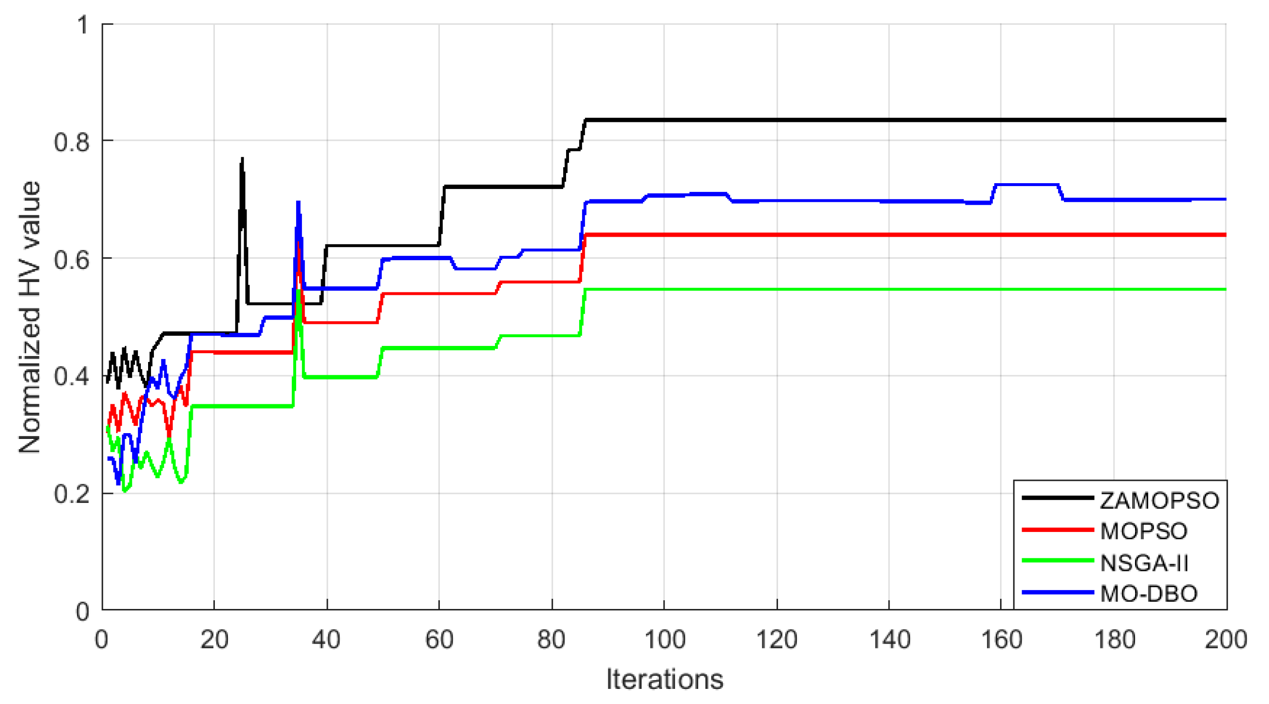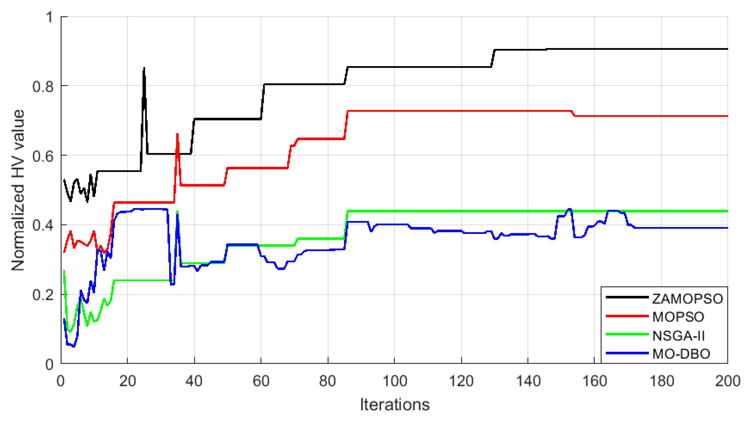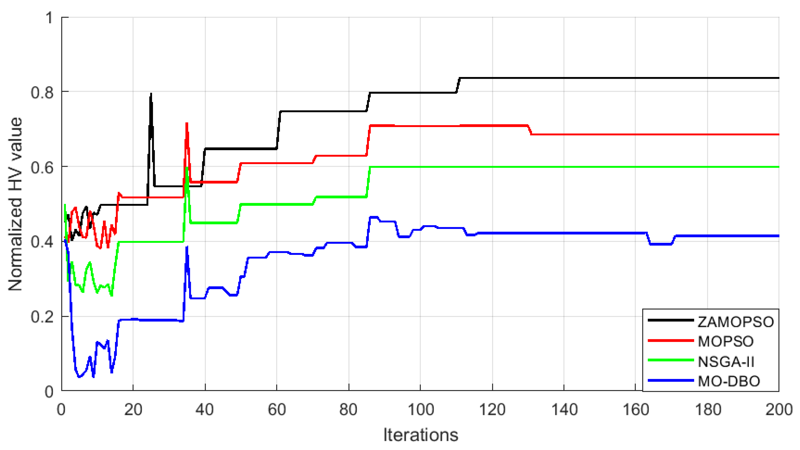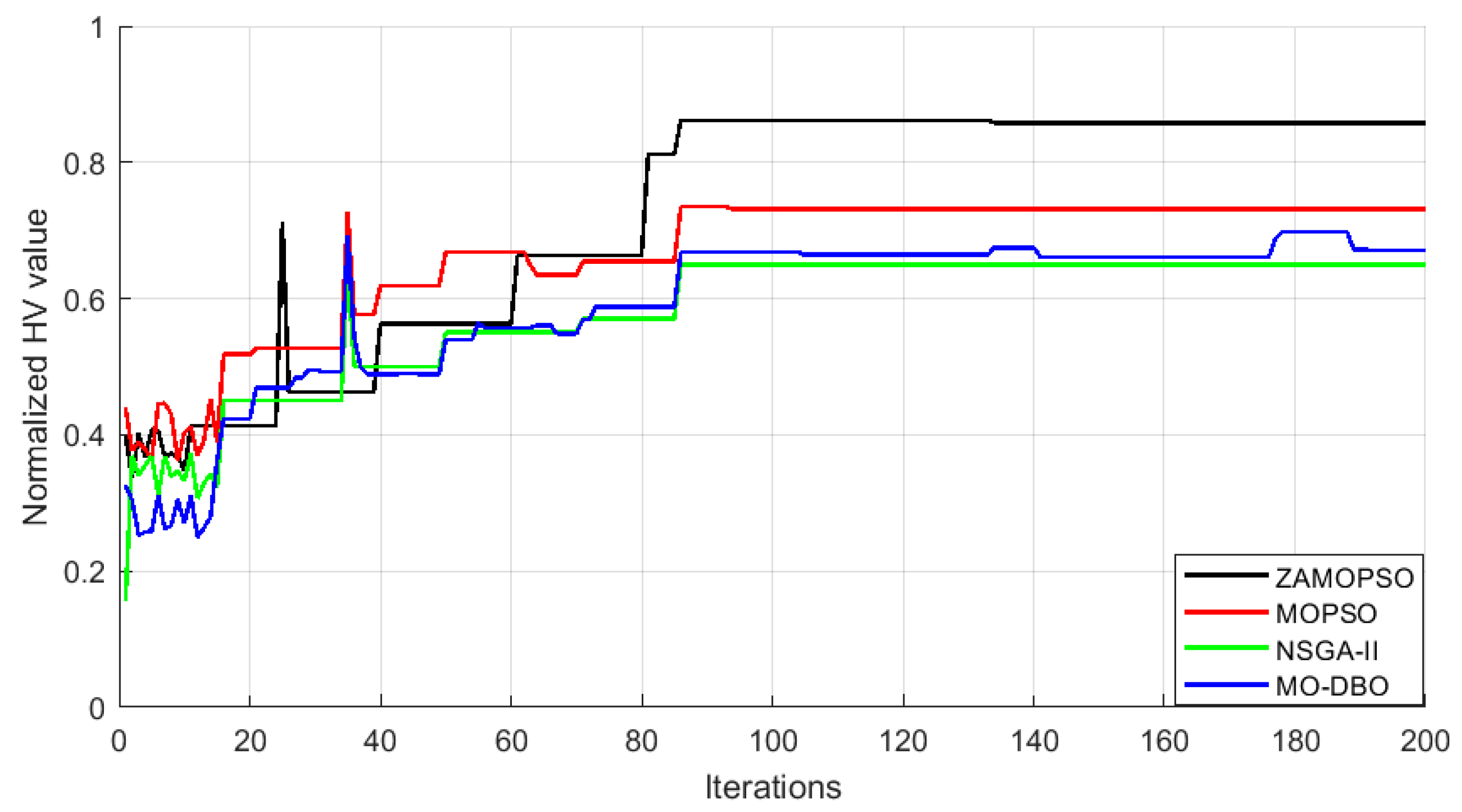 Table 18 displays the comparative HV metric results for each algorithm. As shown, compared with AMOPSO, the maximum HV, minimum HV, and mean HV of ZAMOPSO increased by approximately 21.47%, 36.45%, and 20.79%, respectively, indicating that the particle update strategy based on the Zaslavskii chaotic sequence effectively improved the convergence and diversity of the algorithm. Furthermore, compared with MOPSO, AMOPSO achieved improvements of 5.22%, 48.97%, and 20.37% in the maximum HV, minimum HV, and mean HV, respectively, indicating that the dynamic parameter adjustment strategy and the crowdedness-based guiding particle selection strategy effectively enhance the algorithm’s performance.