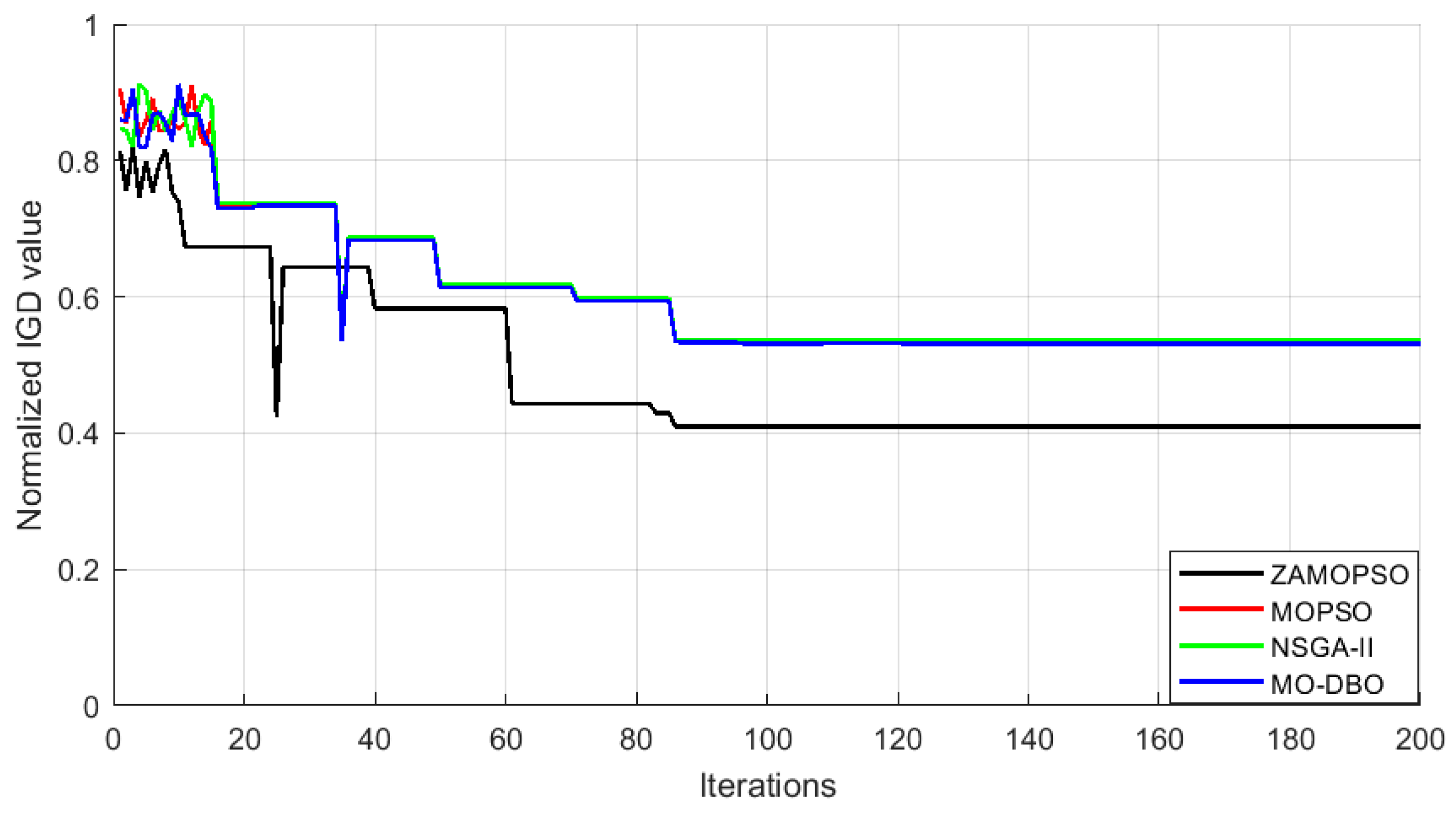 Table 5, indicate that the HV and IGD distributions of ZAMOPSO differ significantly from those of MOPSO, NSGA-II, and MO-DBO (