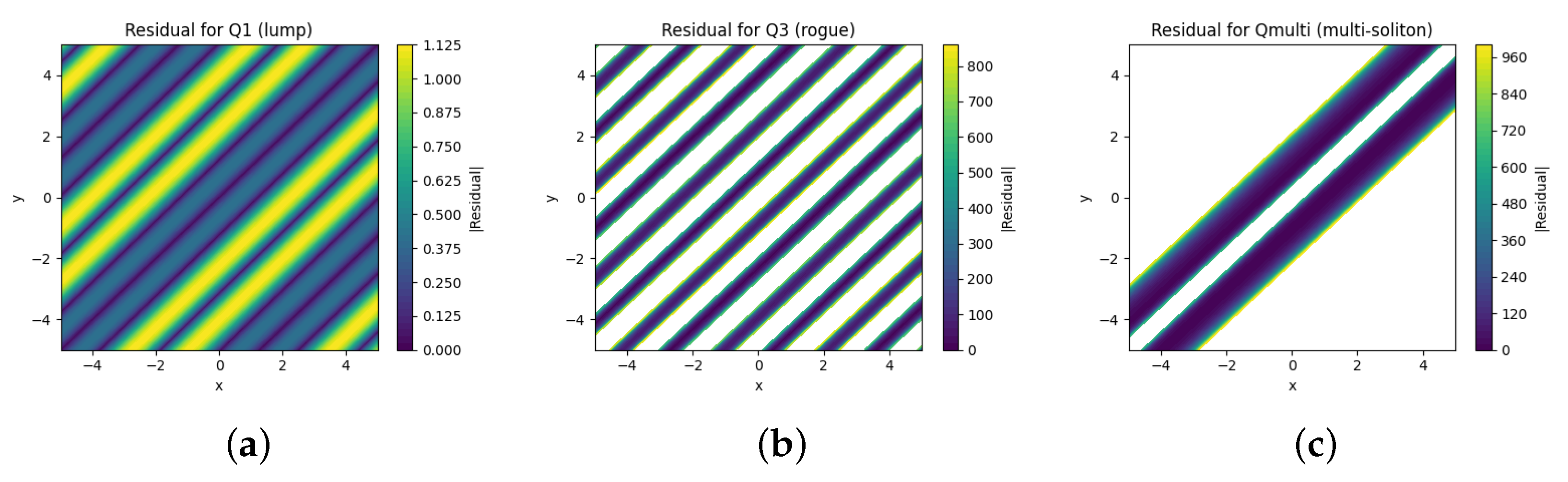 | Single traveling wave | 1-soliton from ; Q via . | Case 1.1 with : , giving (Equation (97)). |