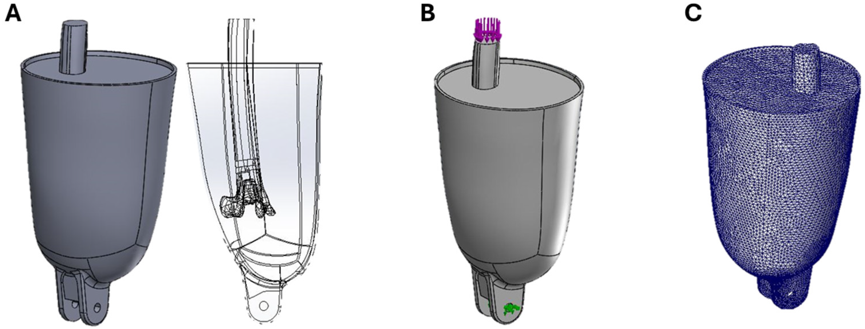 1] pioneered the development of subject-specific, multi-material viscoelastic representations of MRI and in vivo mechanical testing, forming the foundation for data-driven, patient-specific socket design. FEA has also been widely utilized to examine the influence of changes in geometry and material on stress distributions within the limb–socket interface, with implications regarding soft tissue health and mechanical safety [