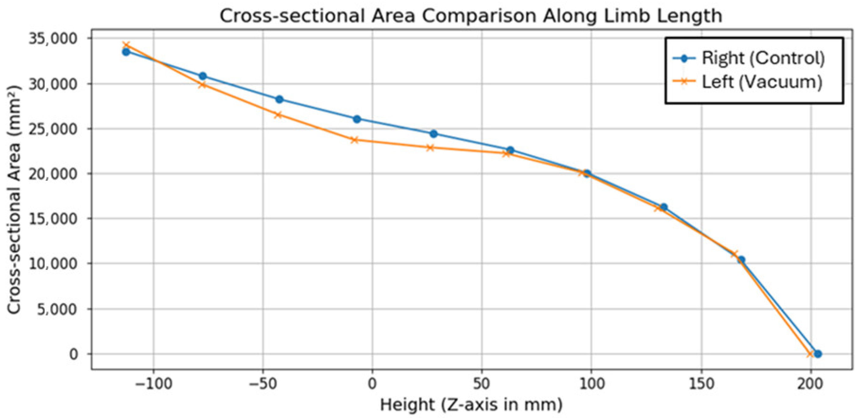 Z-axis for both residual limbs. The plot demonstrates a consistent trend of reduced cross-sectional area in the vacuum-compressed limb compared to the untreated control, indicating measurable soft tissue compression. These differences are most pronounced in the medial region of the thigh, where vacuum application resulted in localized reductions of up to 5.3%. Toward the distal end, the cross-sectional areas of the two limbs converge, suggesting minimal vacuum-related deformation in these regions. Notably, the reduction was not uniform but showed direction-dependent asymmetry, particularly along the anteroposterior axis, highlighting the importance of adaptive socket shaping rather than assuming uniform radial compression. This supports the hypothesis that external mechanical pressure induces volumetric and morphological deformation, which is a critical factor for optimizing socket fit. Elastic strain analysis further confirmed that the residual limb geometries recovered their original shapes upon load removal, with maximum elastic strains of 4.7 × 10