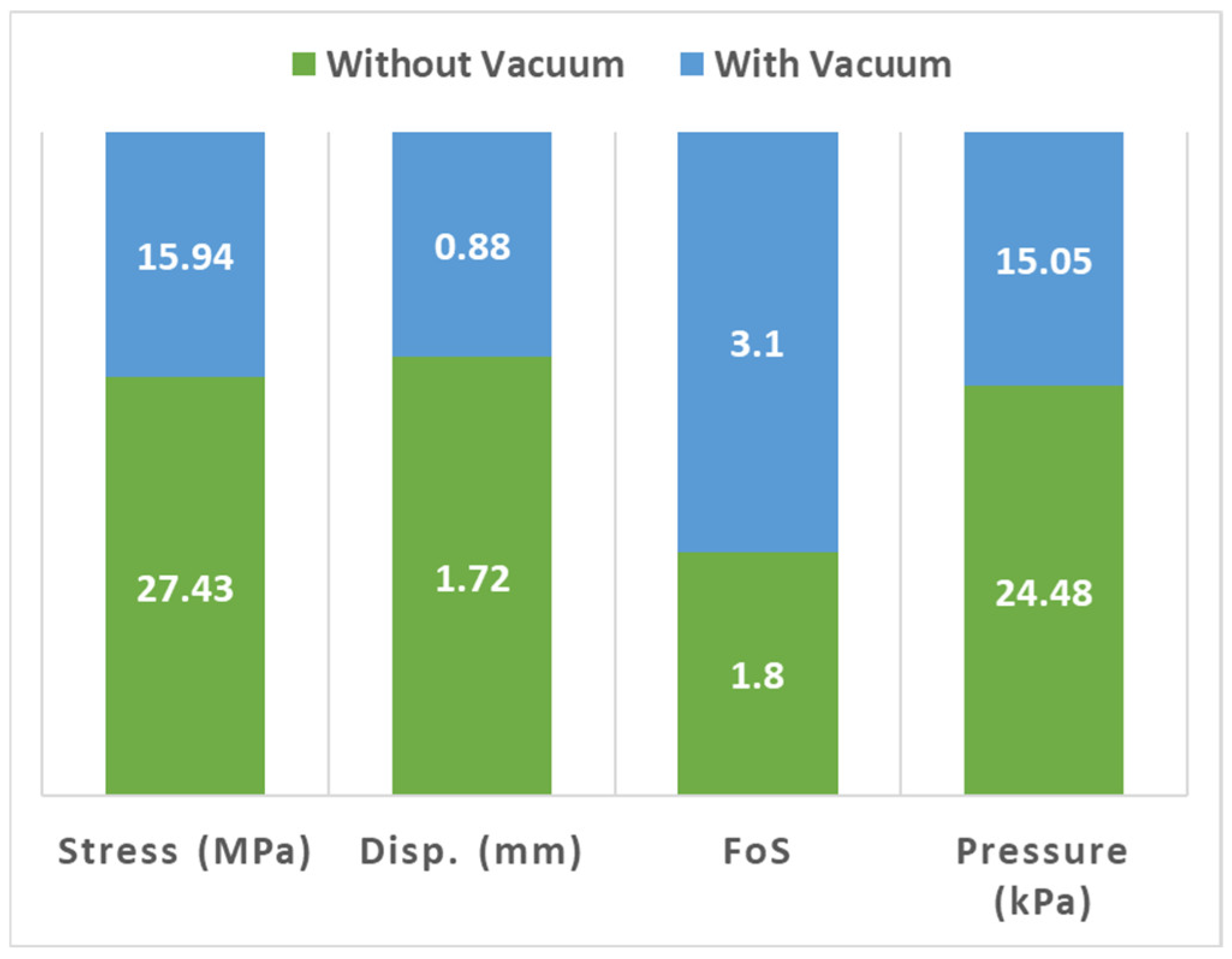 The minimum factor of safety (FoS) observed in the vacuum condition was approximately 3.0, while the non-vacuum condition approached the lower limit of 2.0 in critical load-bearing zones (