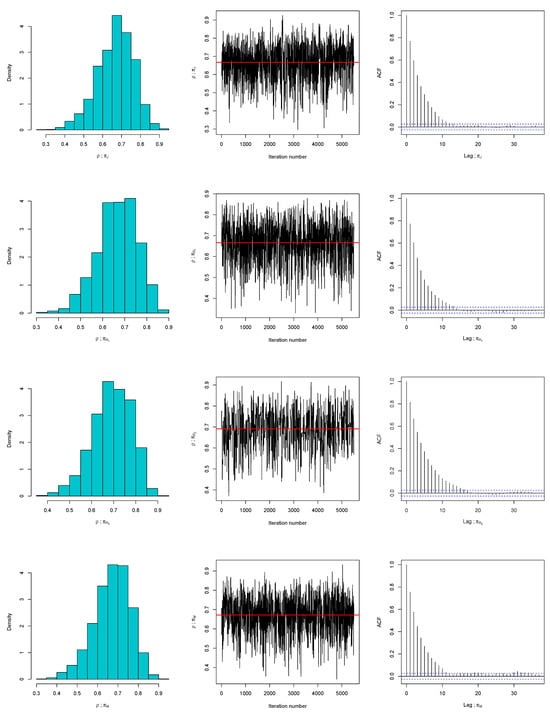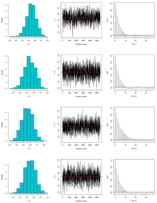 In a similar manner, Algorithms 1 and 2 are employed to draw posterior samples under the assumed priors and observed data, and to evaluate the adequacy of these priors, respectively. As illustrated in Figure 3, the posterior distribution of is well captured by a symmetric Gaussian proposal. Diagnostic plots further support this conclusion: the trace plots display stable fluctuations around the posterior means (marked by solid lines), and the corresponding autocorrelation functions (ACFs) decrease toward zero, indicating efficient mixing and low serial dependence. To assess prior suitability more thoroughly, Algorithm 2 is applied, with histograms and kernel density estimates of the discrepancy statistics shown in Figure 4. These results reveal that replicated samples from the Bayesian predictive distribution align closely with the observed data. Similarly, we run three MCMC chains and compute the Gelman–Rubin statistics. We found that is 1.0016 for , 1.0003 for , 1.0013 for , and 1.00041 for . Since all values of the statistic are well below the threshold of 1.05, the convergence of the MCMC is confirmed. Additionally, the posterior predictive p-values, for , for , for , and for , provide further evidence in favor of the compatibility of the proposed priors.