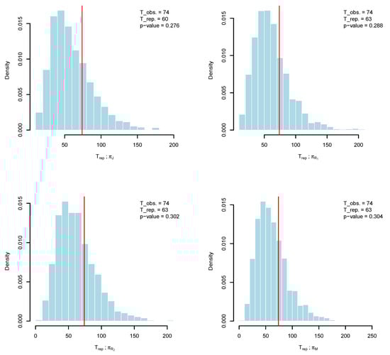 We employ Algorithm 1 to generate samples from the posterior distribution based on the specified prior assumptions and the observed data. The posterior variance-covariance matrix is approximated using the Laplace method, and with a chosen scale parameter of , the resulting acceptance rate is approximately 41%, which falls within the recommended range of 10–40% reported by []. For initialization of the random walk Metropolis–Hastings algorithm, we use the maximum likelihood estimates of and . The Markov chain is executed for 5500 iterations, discarding the first 500 as burn-in, with the remaining draws utilized to compute Bayes estimates under squared error loss (SELF) for the priors introduced in this work. As shown in Figure 1, the conditional posterior distribution of is well approximated by a Gaussian distribution. Furthermore, graphical diagnostics, including trace plots and auto-correlation function (ACF) plots of under the different prior settings, indicate good mixing: the trace plots exhibit random fluctuation around the mean values (denoted by solid red line), while the ACFs decay reasonably toward zero, suggesting minimal auto-correlation. To further check the convergence of the MCMC, we run three chains and compute the Gelman–Rubin statistics (); a value close to 1 or below 1.05 indicates convergence []. We found that is 1.0003 for , 1.0012 for , 1.0007 for , and 1.0008 for . Clearly, the Gelman–Rubin statistics under the four priors are well below the threshold of 1.05, confirming convergence. To further examine the suitability of the prior choices, we implement Algorithm 2, presenting histograms and kernel density estimates of the discrepancy statistics in Figure 2. The results demonstrate that replications from the Bayesian predictive density closely align with the observed data. In addition, the posterior predictive p-values, for , for , for , and for confirm the compatibility of the proposed priors.
