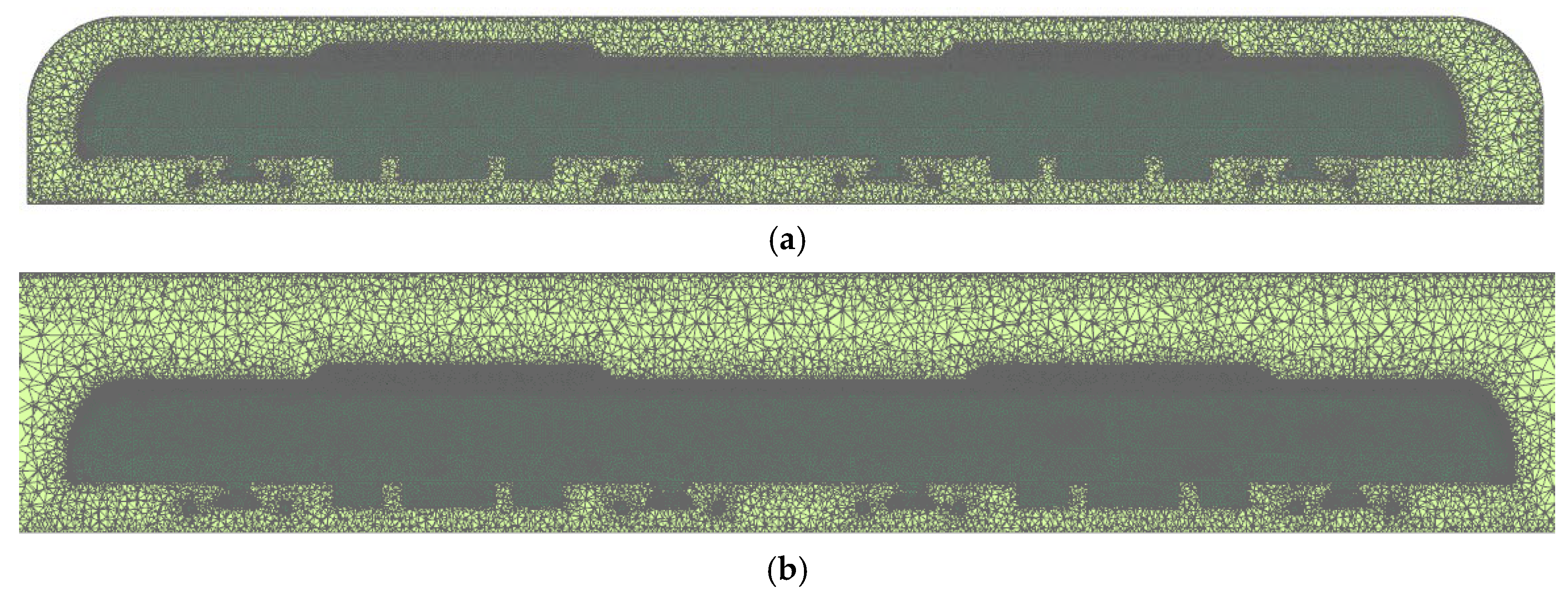- Yin, Z.; Zhang, J.; Zhang, C.; Chen, Y. The Influence of High-Speed Train Streamline Length on Aerodynamic Performance. In Proceedings of the Fifteenth National Nonlinear Vibration and the Twelfth National Conference on Nonlinear Dynamics and Motion Stability, Changsha, China, 8–10 May 2015. [Google Scholar]