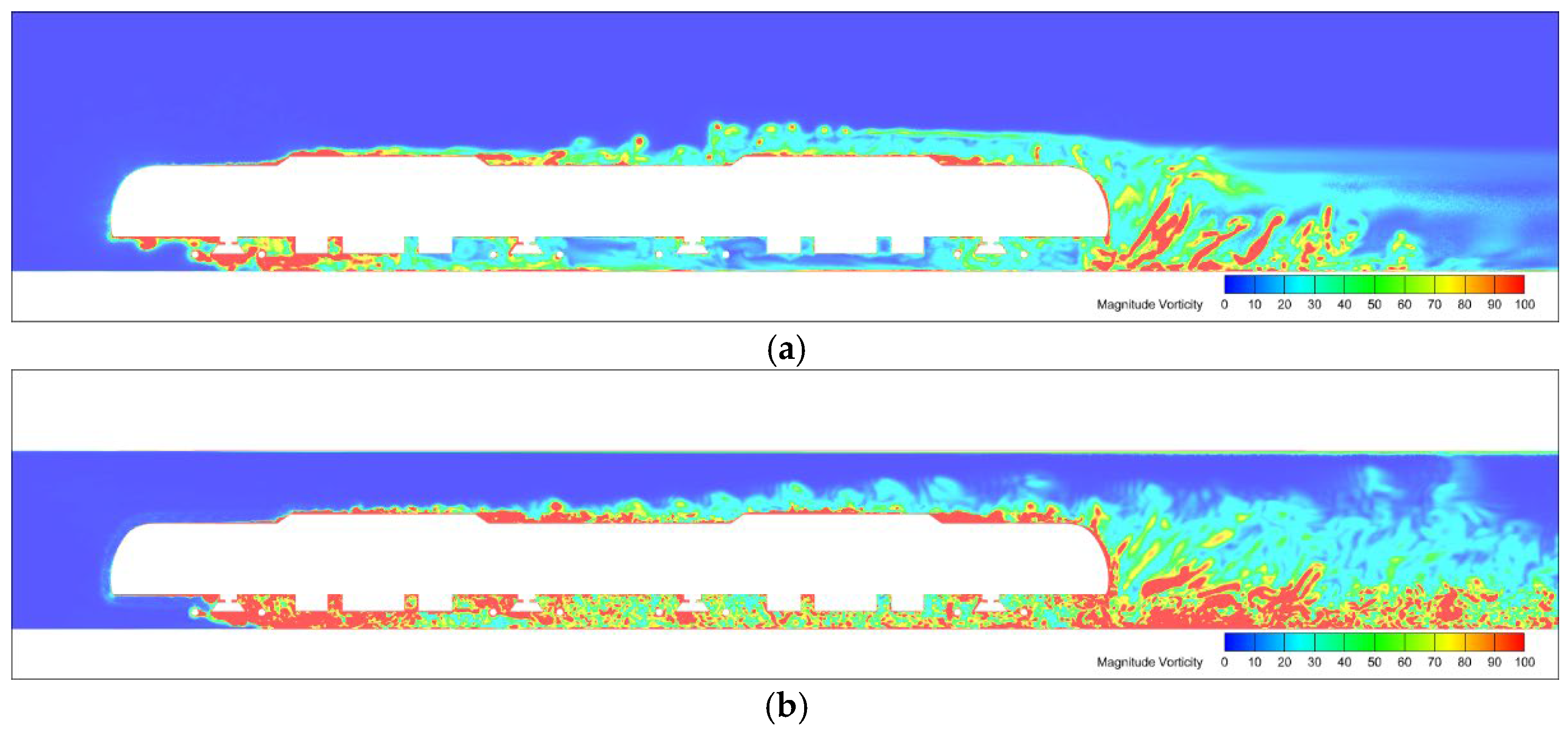 - The flow field structures around the trains on open tracks and within the tunnel exhibit similarities. However, there are significant differences in their intensities and scales. Notably, the cavity flow formed between two air conditioning units in the tunnel shows approximately a doubling in the intensity of the vortex structures.