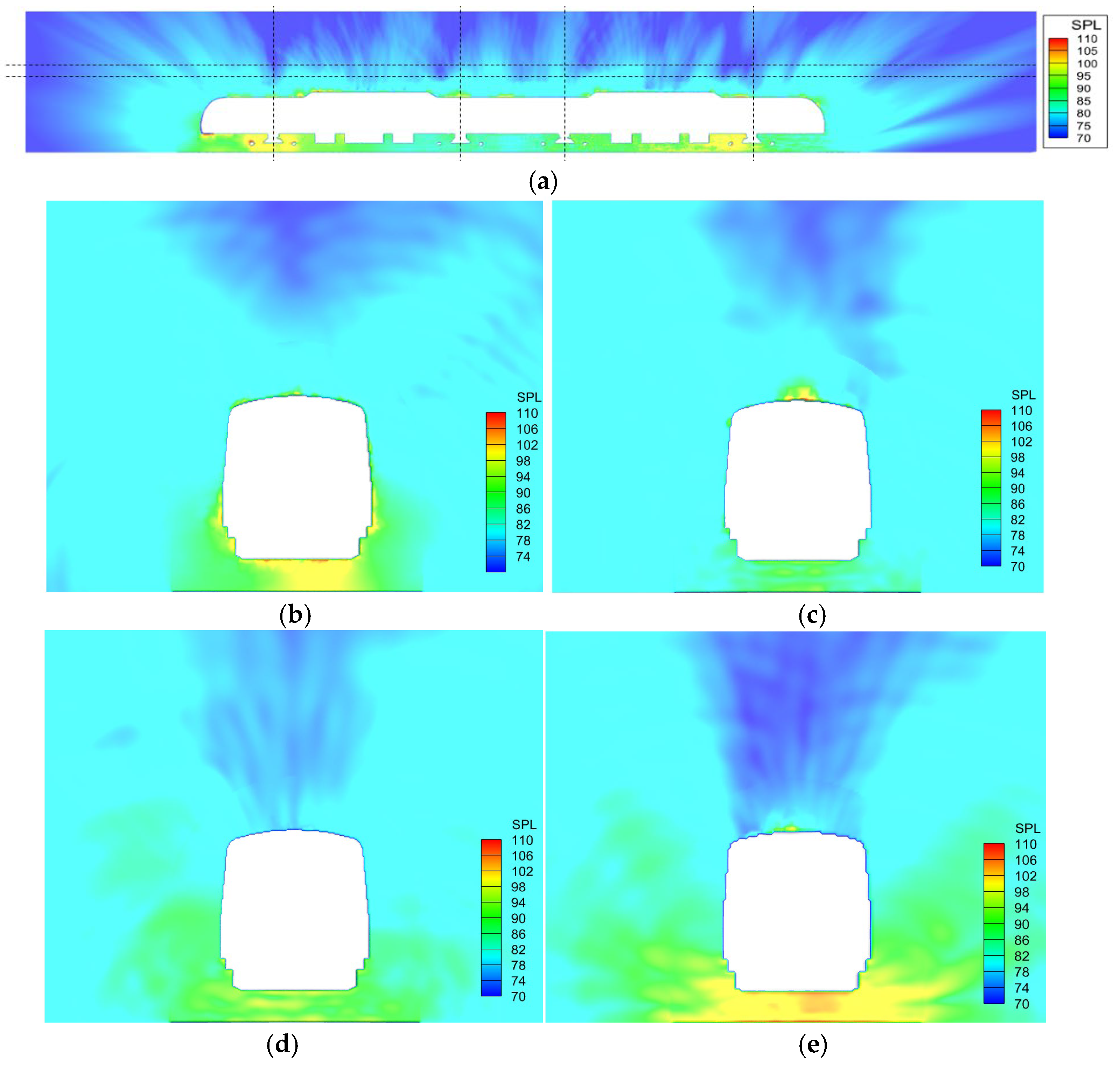 - In tunnels with a high blockage ratio, the positioning of subway train air conditioning units either too high, concentrated, submerged, or outfitted with sound-absorbing materials can effectively lower the sound pressure levels in these areas, thereby enhancing the acoustic performance of the train within the tunnel.
