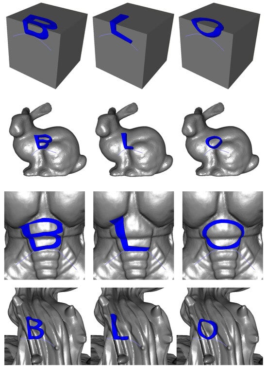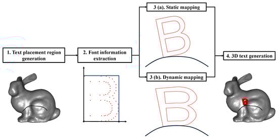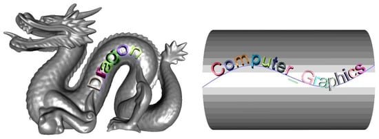 Visualization on 3D meshes plays a vital role in simulation and data analysis [,]. As the demand for 3D digital content increases, techniques such as embedding data into 3D models [,,] and displaying information as text [,,,,] have become essential in applications including augmented reality (AR) environments, digital watermarking, and model identification. A key challenge in these applications is embedding text while faithfully preserving the geometry of the underlying mesh.