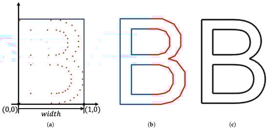 where and are control points. We extract font outlines using the FreeType library [], which provides the 2D control points for each linear and quadratic segment (Figure 3). Each segment is then uniformly sampled with respect to the parameter t, and connecting the sampled points sequentially forms a closed polyline that represents the original outline (Figure 3c). Since the raw coordinates obtained from FreeType are not normalized, each outline is uniformly scaled so that the horizontal length of its bounding box is set to one. After normalization, the x-coordinates of all control points lie within (Figure 3a), ensuring consistent sizing across different characters.