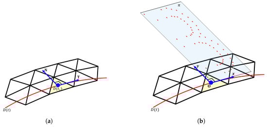 (a) Local tangent frame constructed at . (b) Control points represented in the local coordinate system, lying on plane .
