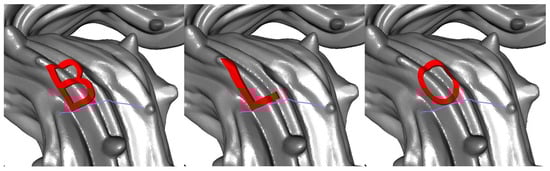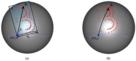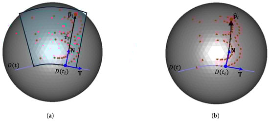 A local tangent frame is computed at the point , and the corresponding control point is mapped to the point on (see Figure 6). Here, L, defined by