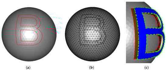 Outline-based mesh segmentation for the character ‘B’: (a) the outline generated by geodesic Bézier curves; (b) the mesh trimmed along the outline in (a); (c) the final result after trimming, where blue faces represent and red–green vertex pairs indicate .