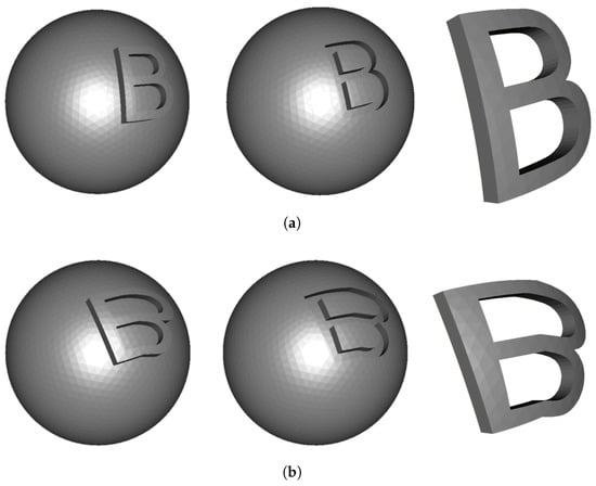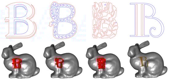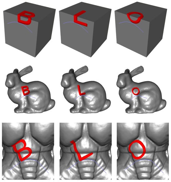 To overcome these limitations, Dhiman et al. [] and Li et al. [] proposed generating 3D text meshes directly from vector-based font information. Specifically, Li et al. [] employed TrueType Fonts (TTFs) [], which define character outlines using Bézier curves. In their approach, points are sampled along the curves, and the front faces are constructed using Delaunay triangulation. The back faces are generated by duplicating the front faces with an offset along the z-axis, and the two regions are connected to form a closed 3D mesh. The resulting text mesh is then embedded into the target model through Boolean operations [,] such as union or difference. Although effective on smooth surfaces, Boolean embedding produces text that does not conform to the target surface geometry, resulting in flattened shapes on curved or intricate regions (Figure 1a).