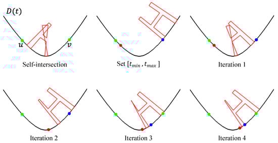Self-intersection avoidance by interval refinement via binary search. Green points indicate the self-intersection interval where self-intersection occurs. Red and blue points denote the bracketing parameters . When self-intersection occurs at the midpoint, is updated; otherwise, is updated while conforming to the geometric features.