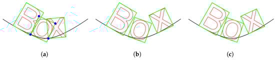 In addition to the self-intersection problem discussed in Section 4.1, collisions between adjacent character outlines may also occur when multiple characters are placed along the curve . Unlike self-intersections, such collisions can occur under both static and dynamic mapping strategies. To detect collisions, each outline is enclosed by an oriented bounding box (OBB) (Figure 11). Collision detection between two OBBs is performed by evaluating winding numbers []. The winding number measures how many times a closed curve winds around a point . For a bounding box B, it is defined as