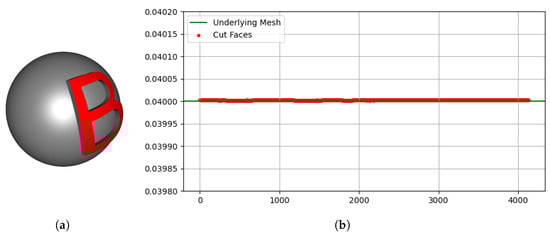 To quantitatively evaluate geometric accuracy, we conducted an experiment using a sphere of radius 5. As shown in Figure 16, the Gaussian curvature of the underlying sphere surface (, green line) was compared with that of the vertices of the embedded text region (red dots). Boundary vertices were excluded from the evaluation because their local neighborhoods degenerate into half-discs during curvature estimation, leading to inconsistent values. The results in Figure 16b demonstrate that the curvature in the embedded region closely matches the curvature of the underlying mesh, with only minor deviations due to numerical computation. This confirms that the proposed method effectively preserves the curvature of the underlying mesh when generating 3D text.